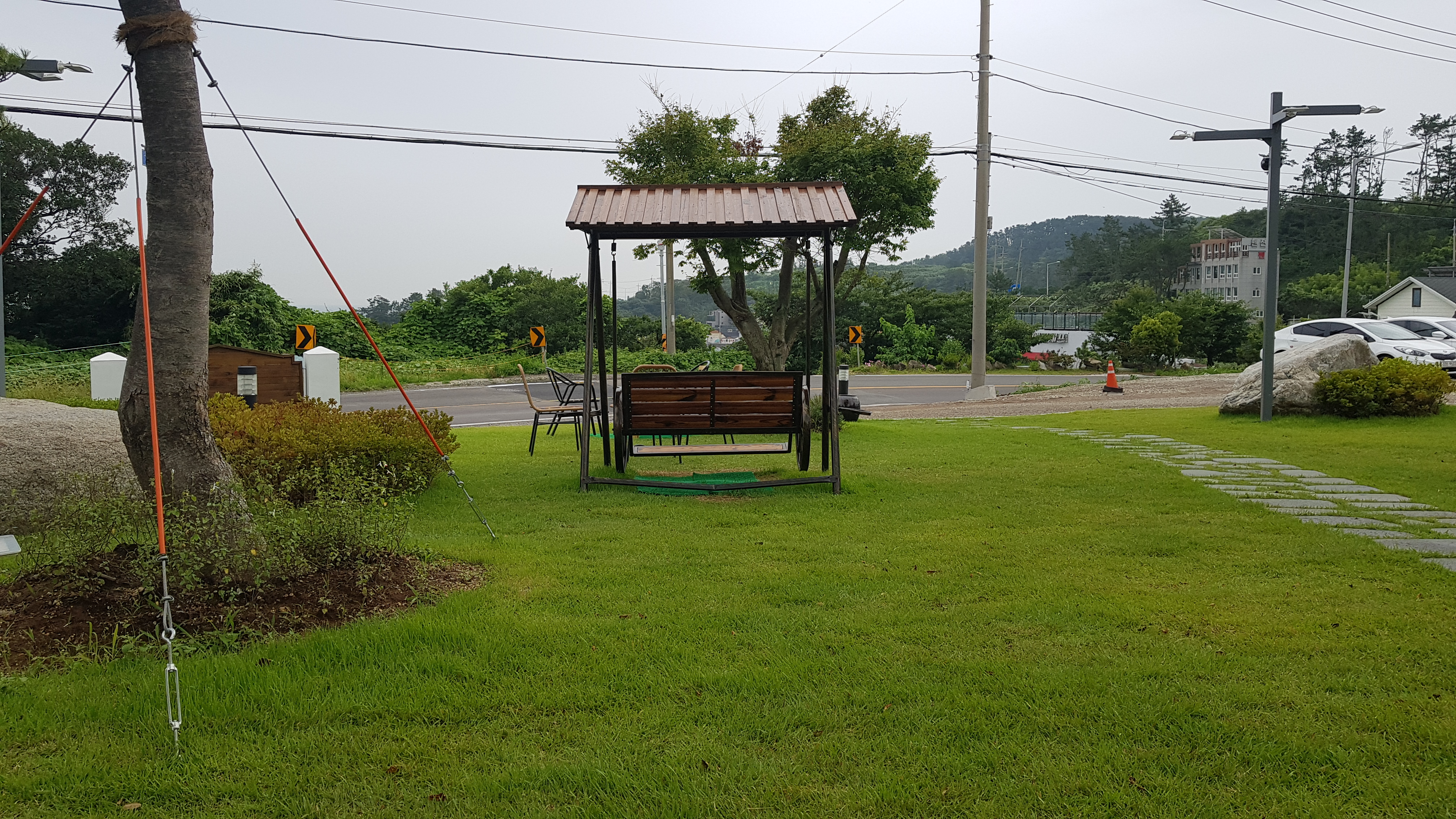 카페 정원에 잔디고 곱게 깔려있고 좋지만 아쉬운 점이 있다. 도로에 바로 접해있어서 야외테이블 어디에 앉던지 주차장에 주차된 차들이 보이고 도로가 보인다. 도로에 차가 지나가면서 엔진소리가 들리고 매연 냄새가 난다. 토곡요 정도의 한적함과 여유를 즐길 수 없는것이 아쉽다.