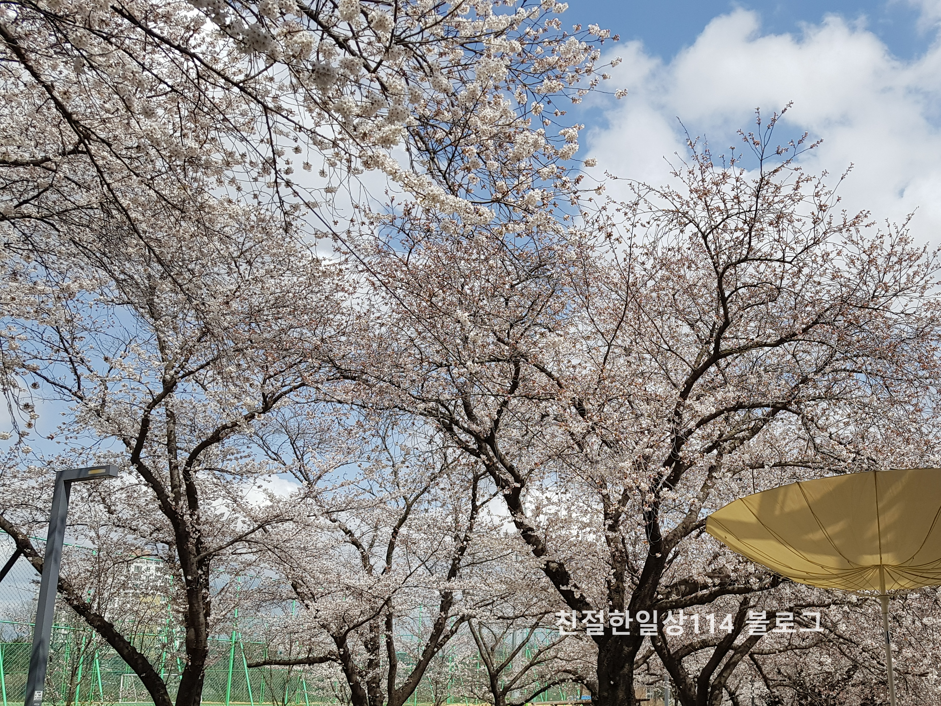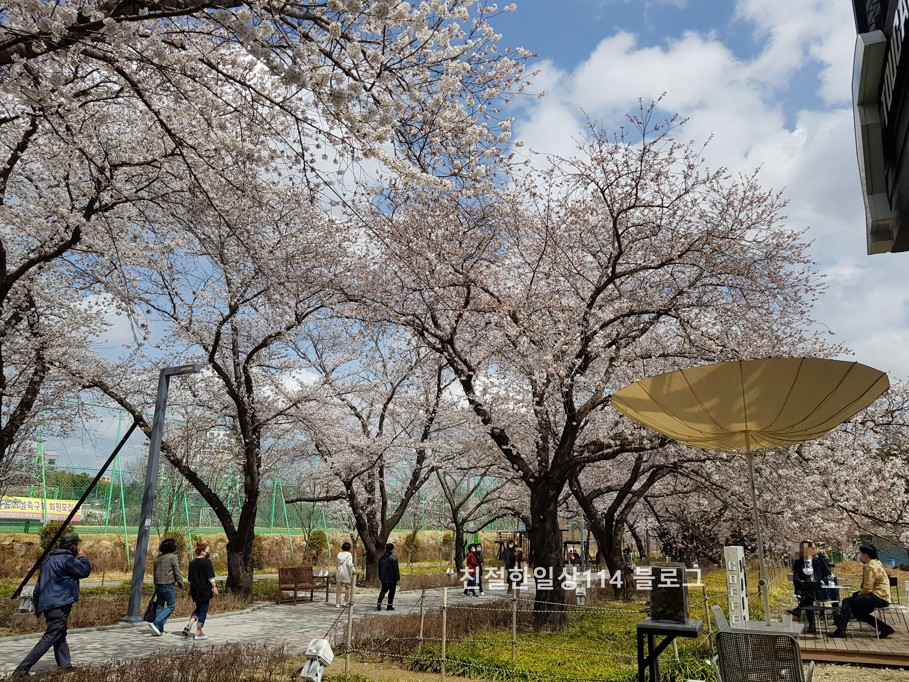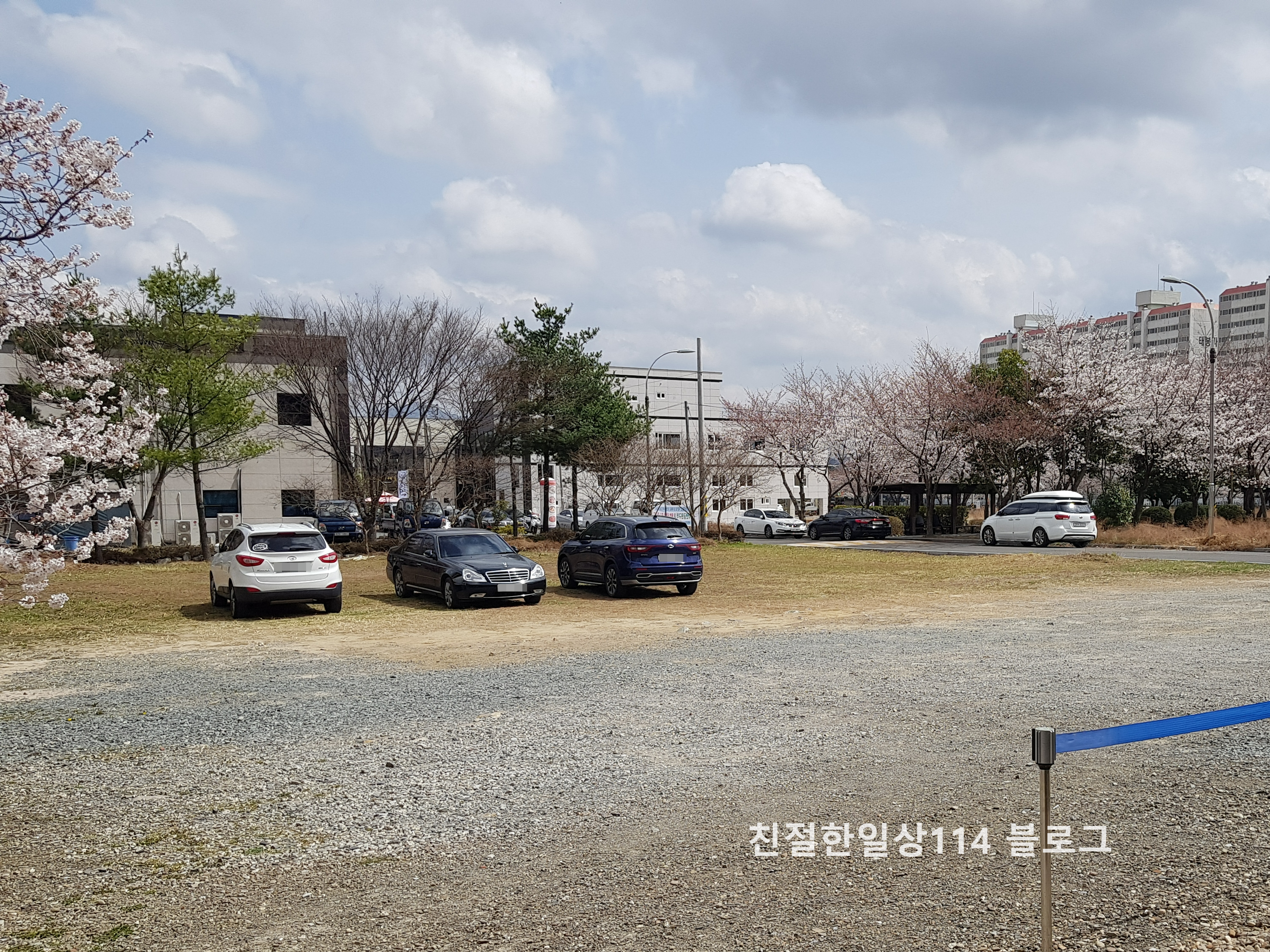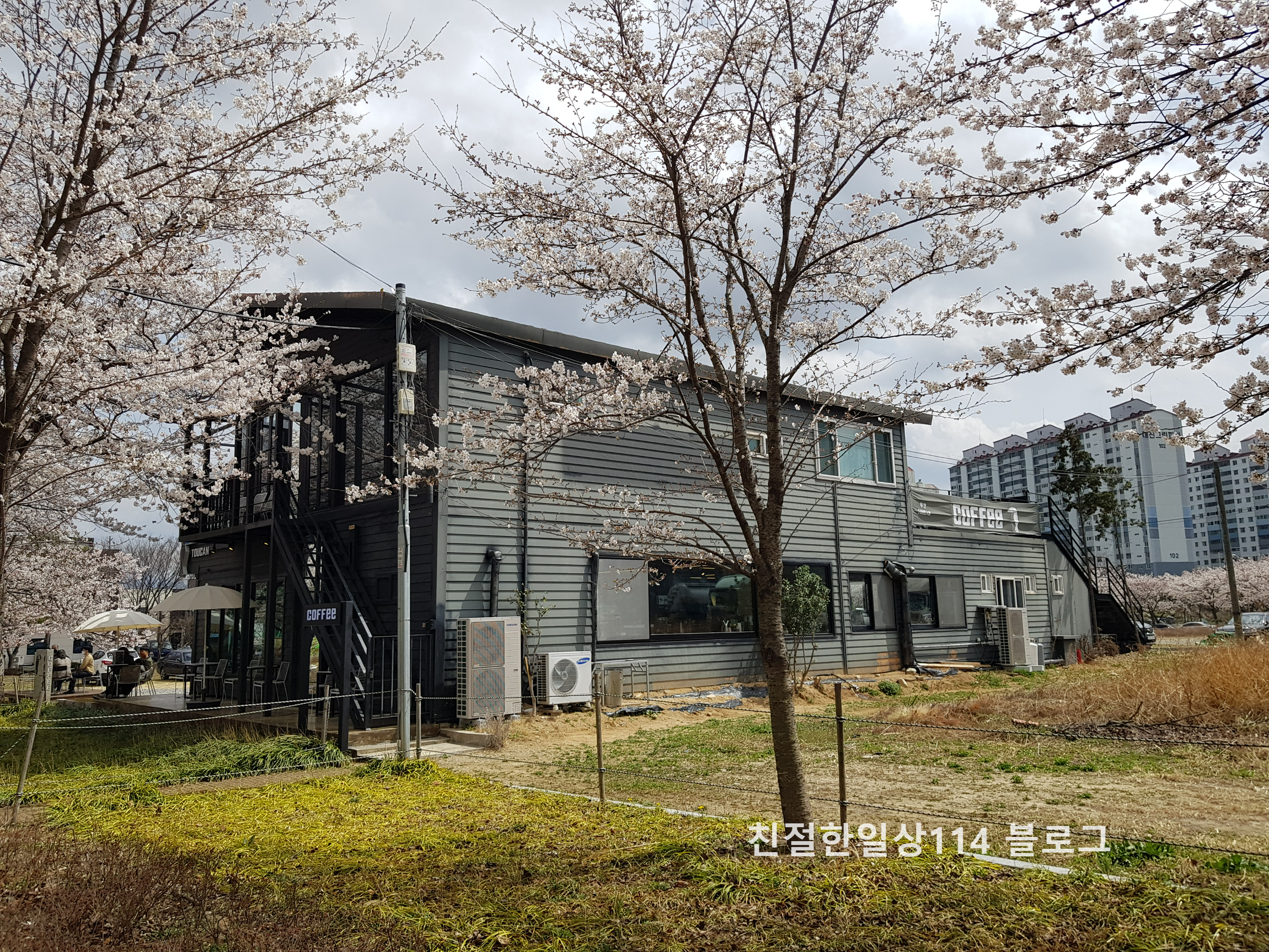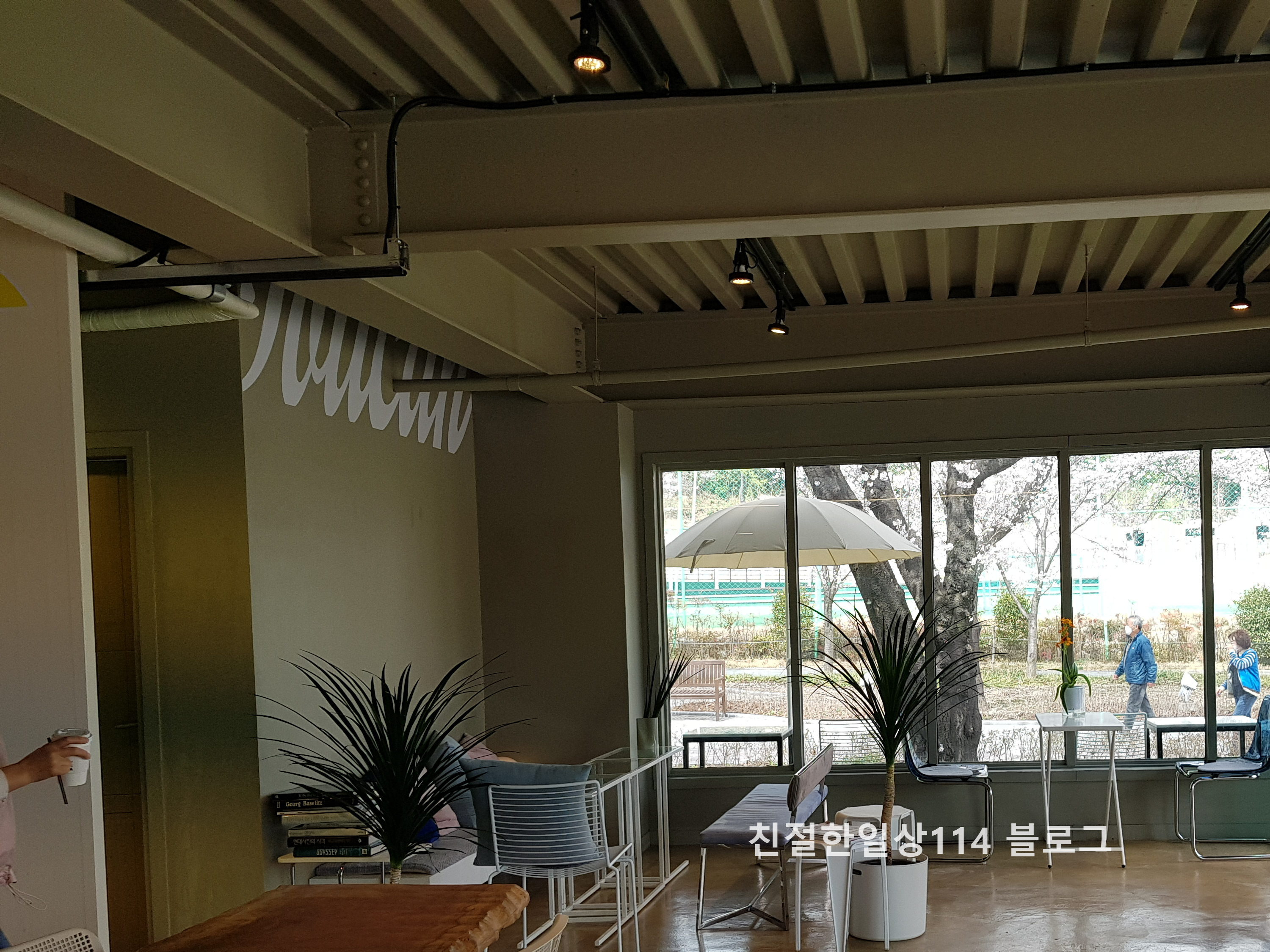 건물 주차장쪽에는 자갈이 깔려있고 야외 파라솔 테이블이 있어 시원하게 그늘에서 벚꽃을 구경할 수 있다.