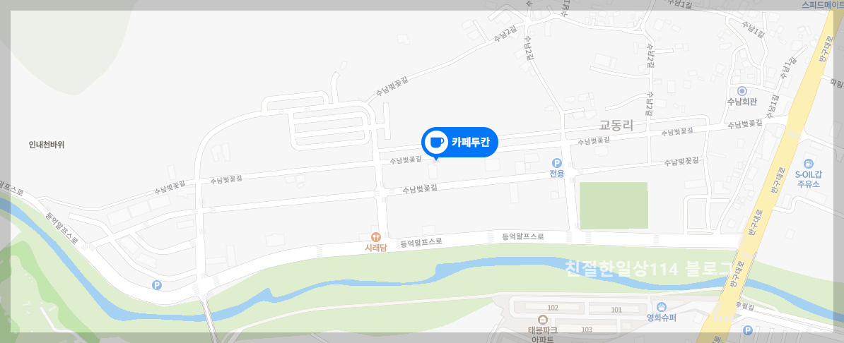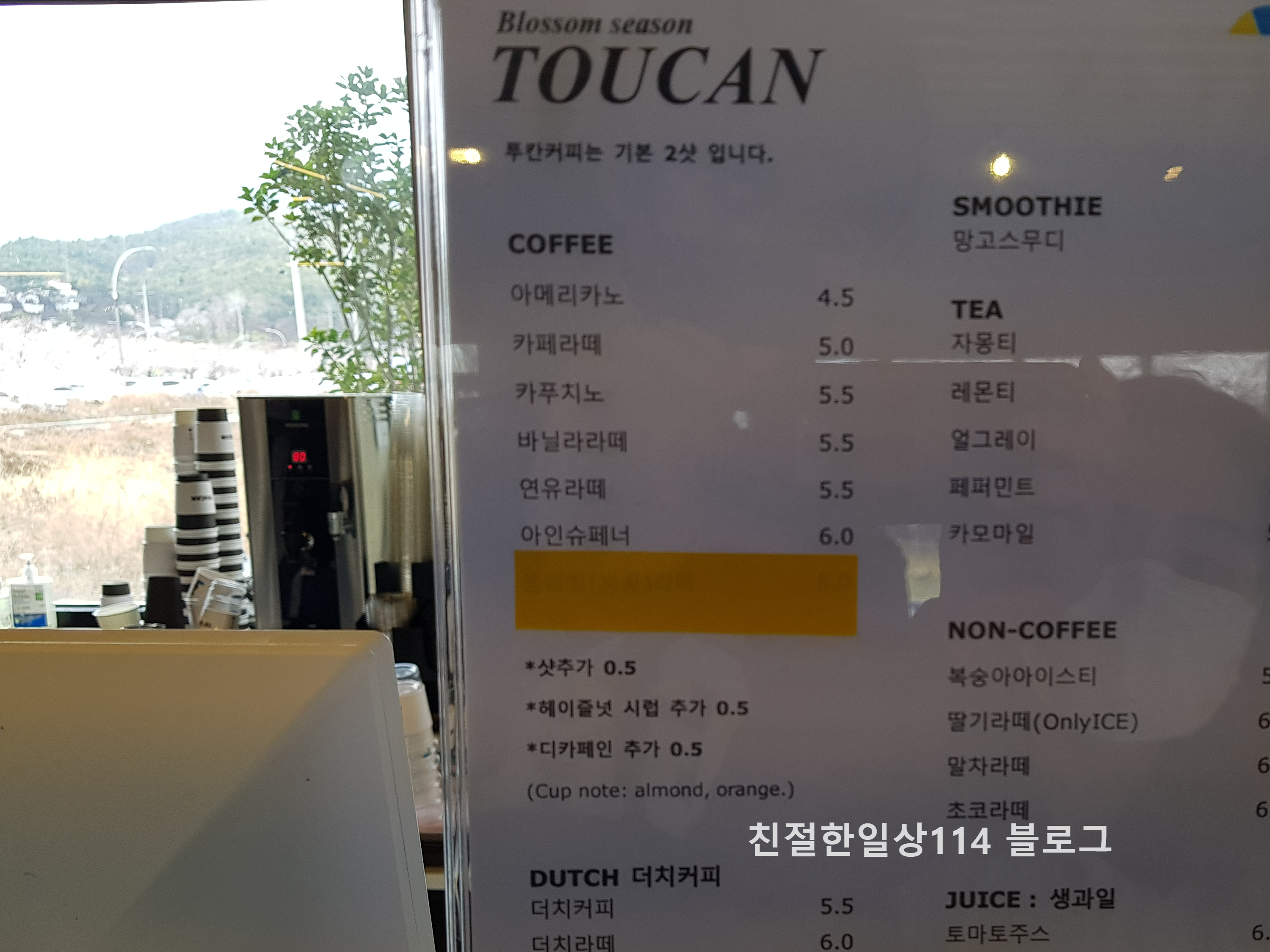 수남벚꽃길 중간에 많은 식당과 카페가 있는데 오늘은 그 중 한곳인 카페 ‘투칸’ 방문 후기를 올려보려고 한다.