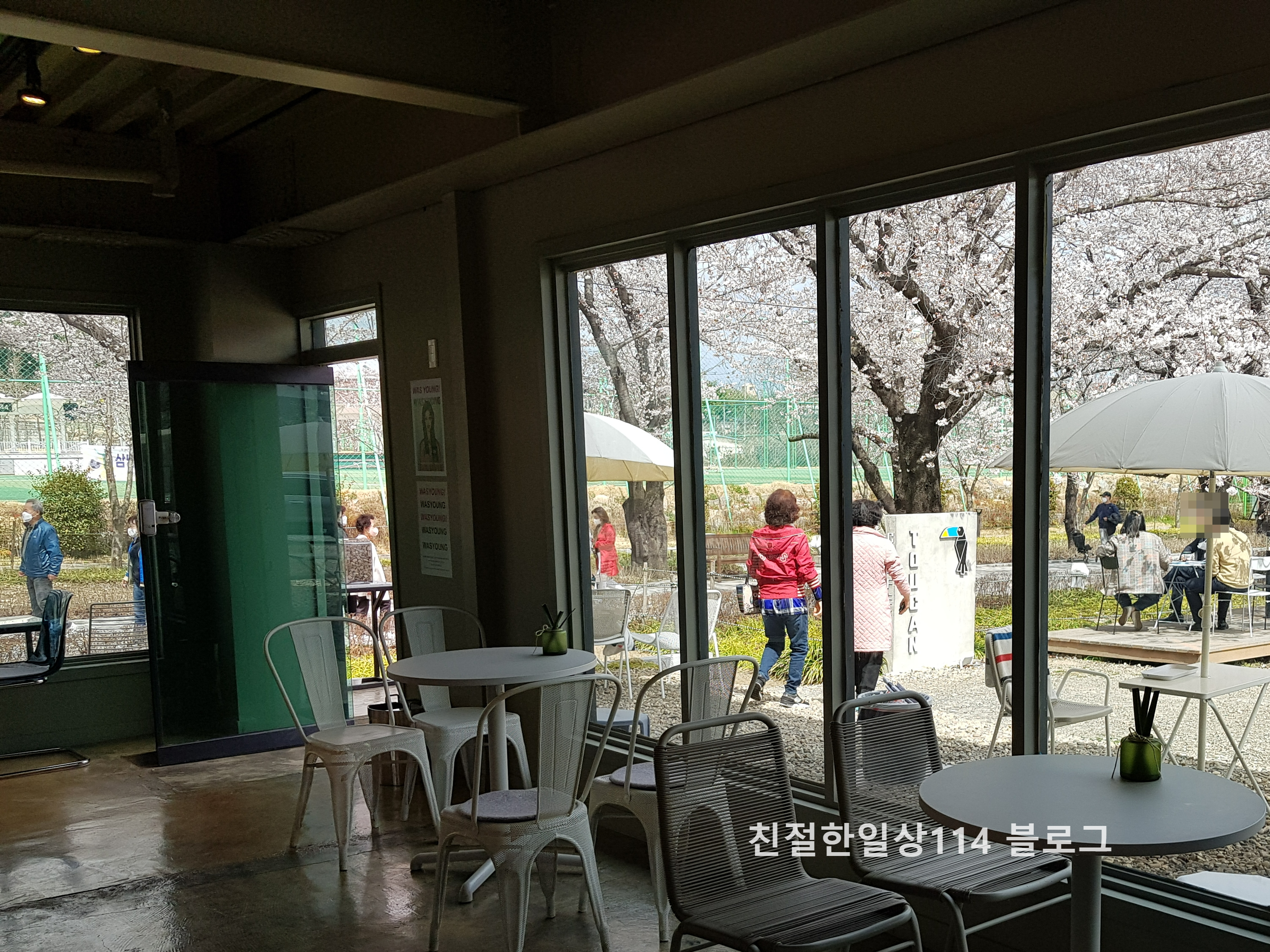 넓은 공간에 테이블이 여러개 놓여있고 바깥 테라스 쪽으로도 테이블이 있다. 손님들 대부분이 야외에 벚꽃이 보이는 쪽 테이블로 몰려서 실내 테이블은 비어있는 상태다.