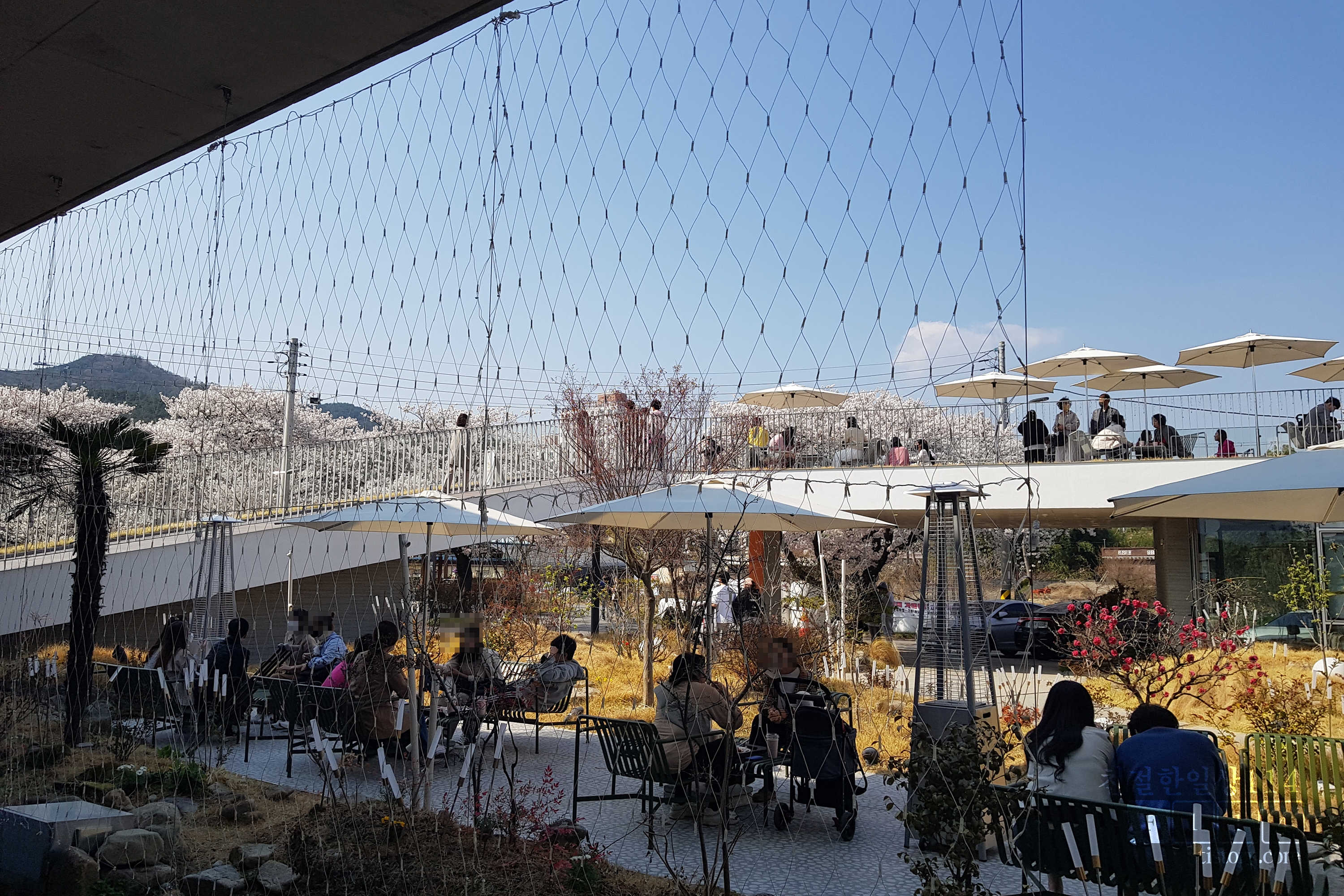 2층에는 수남벚꽃길을 볼 수 있어서 인기가 많다. 앉을 자리가 없어서 사람이 앉아 있는 테이블 옆에는 기다리고 있는 사람이 한사람씩 있을 정도이다.
