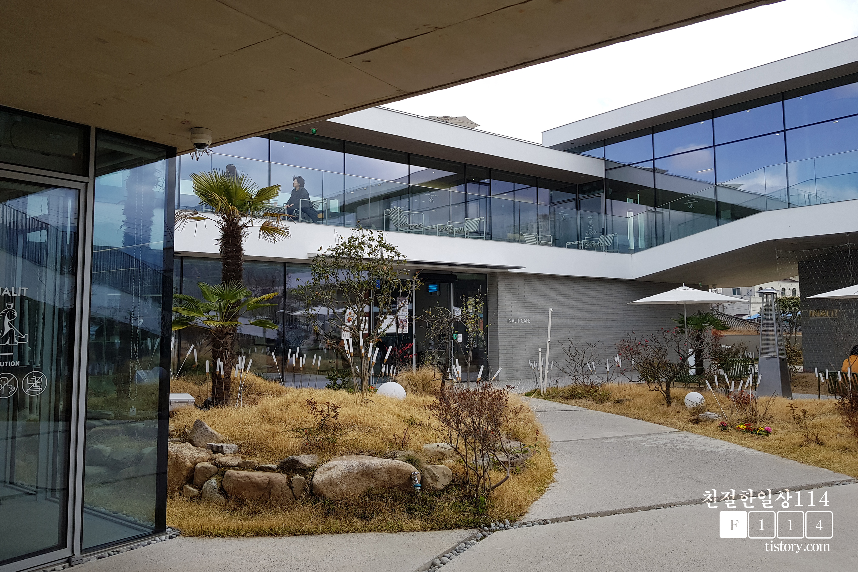 이너리트 카페 건물은 멀리서도 눈에 띈다. 주차를 하고 가까이 가서 보면 기하학적이며 특이한 외관이 신기하다.