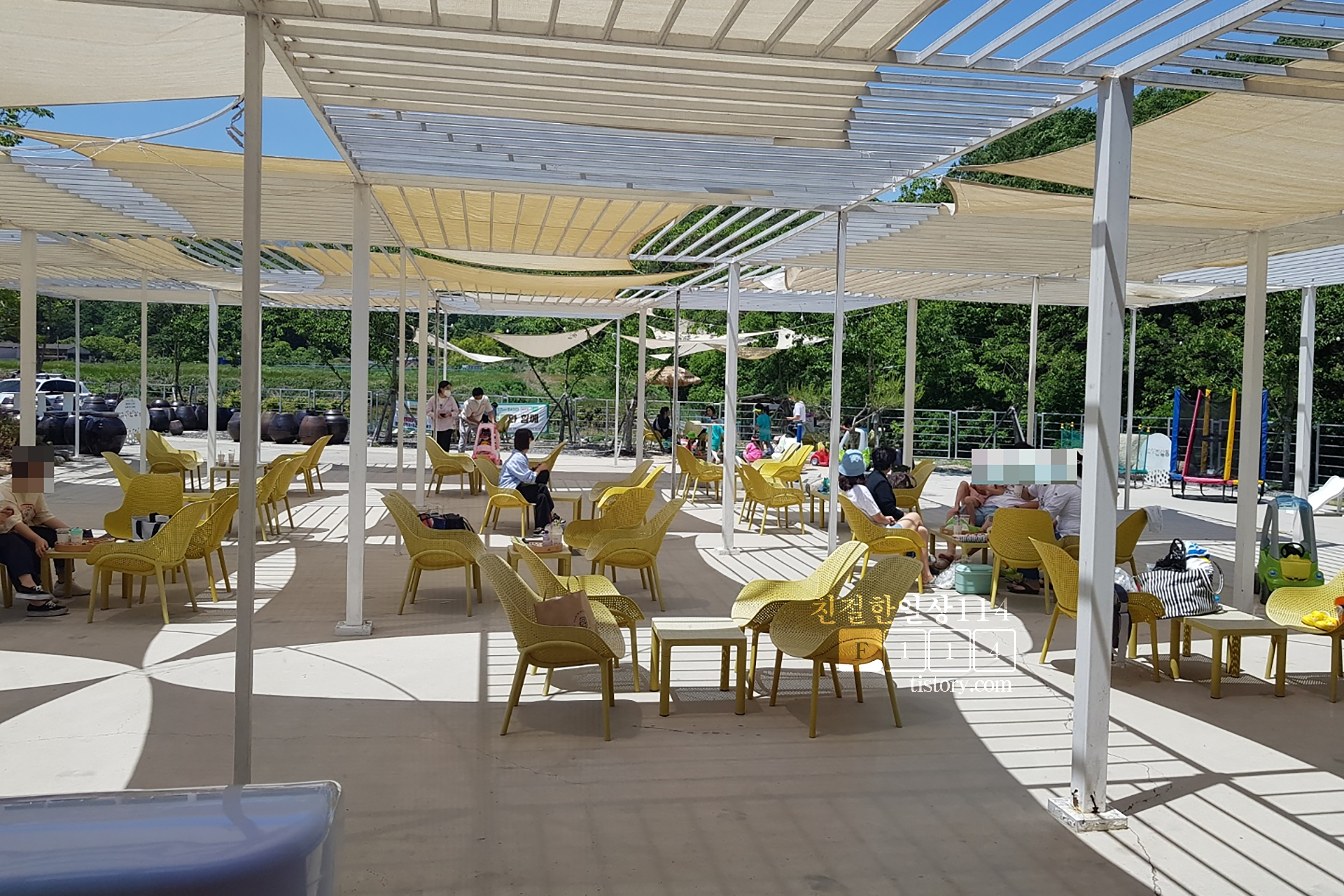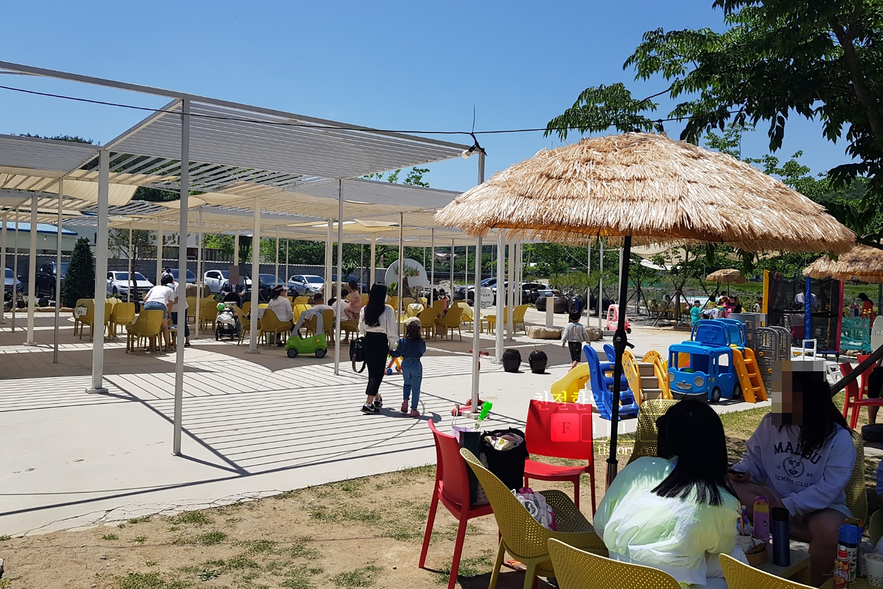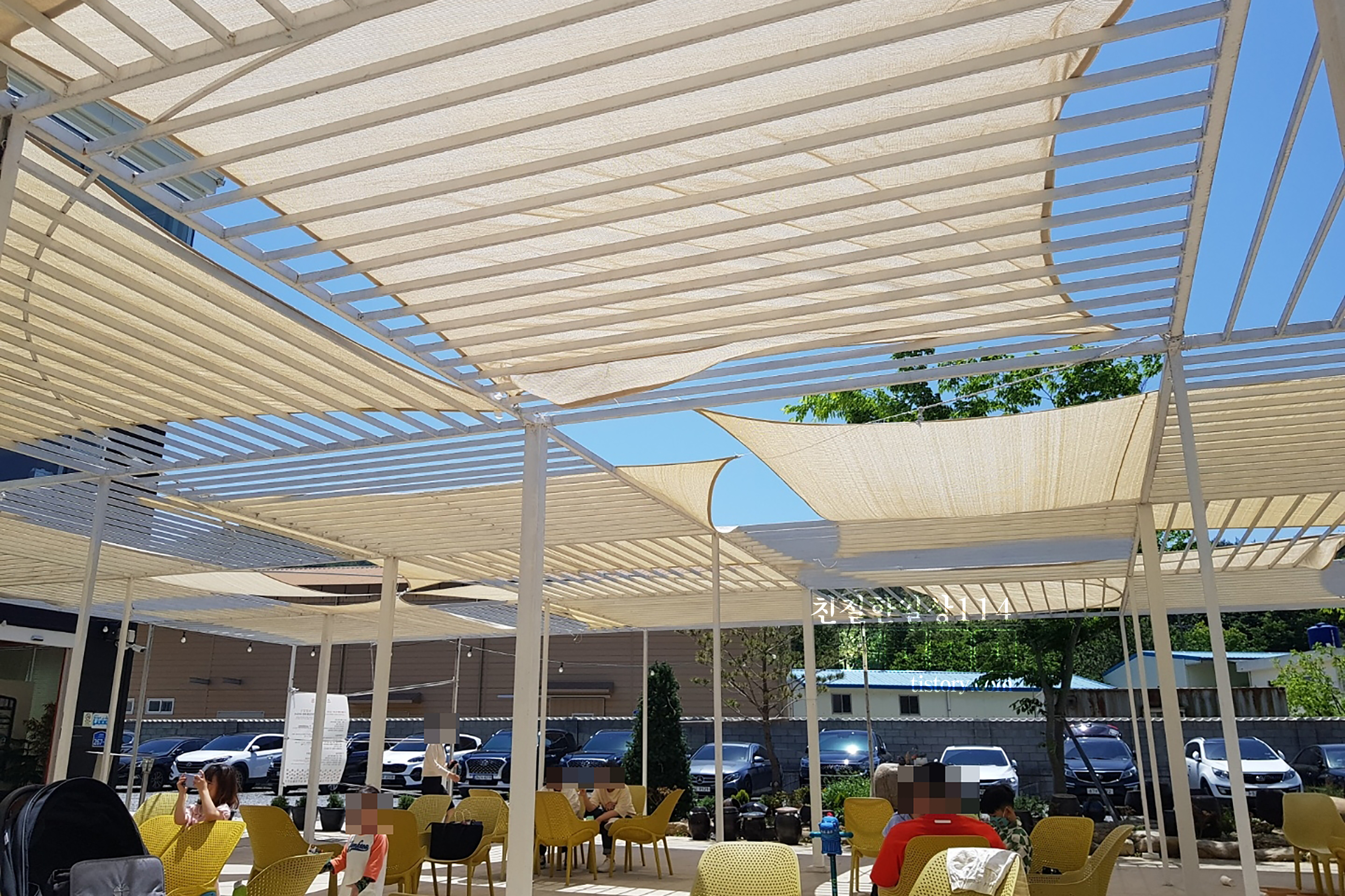 카페에서 아이가 마실 음료와 어른들 커피를 주문하고 마당이 있는 쪽으로 나가본다. 상당히 넓은 마당에 테이블마다 그늘이 드리워져 있다.