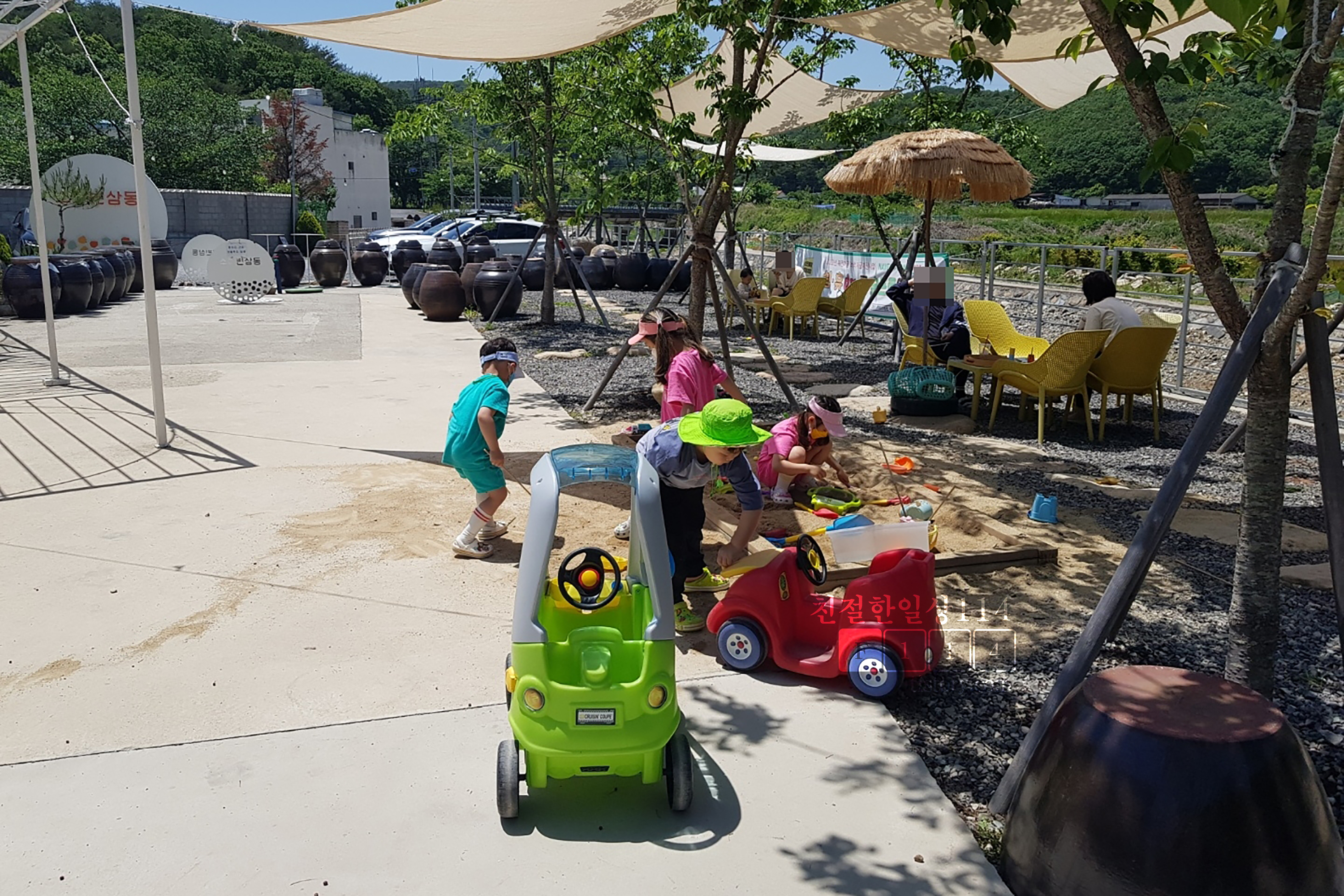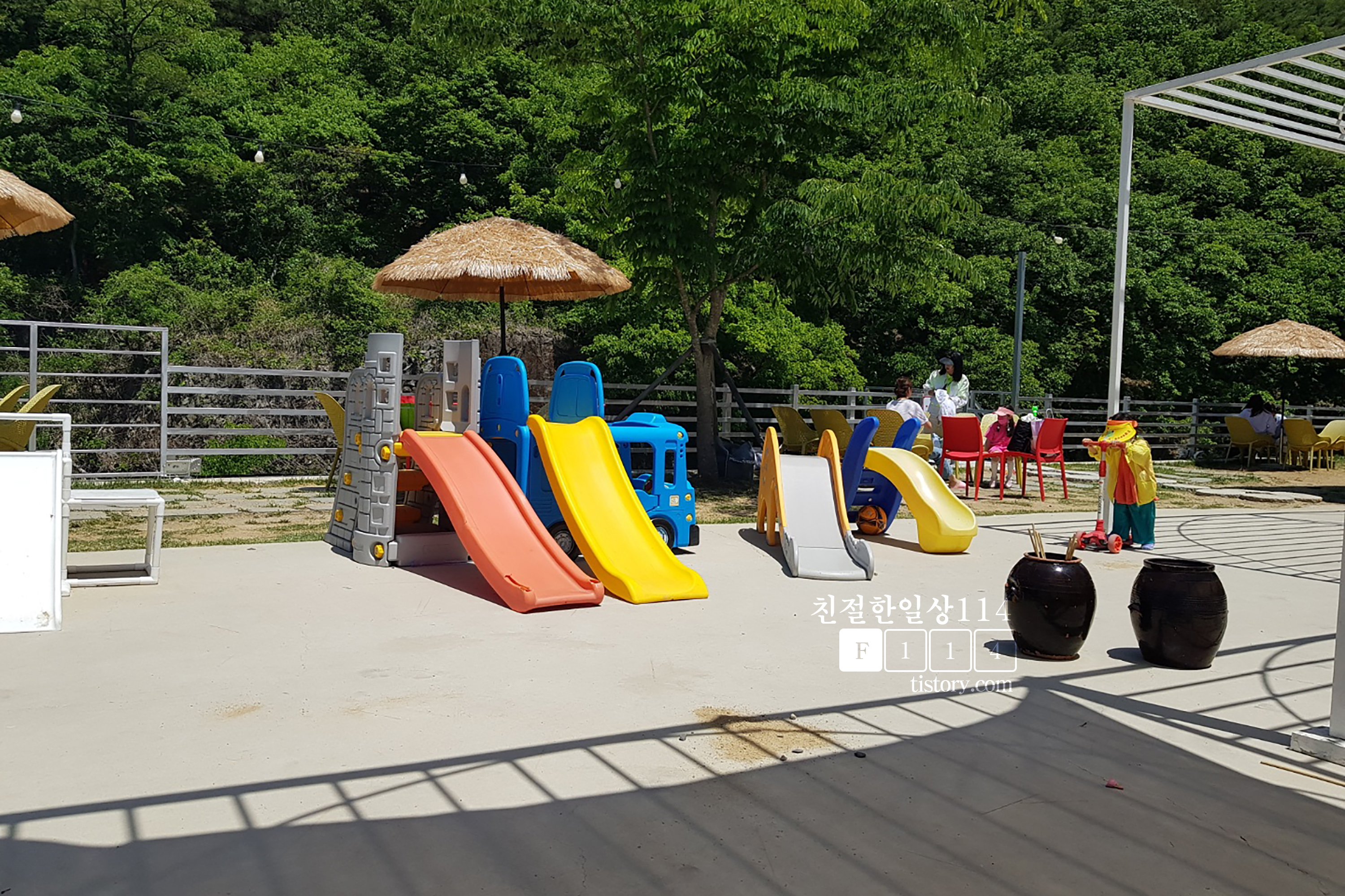 계곡물에 발을 담그고 다시 카페 마당쪽으로 올라와서 장난감을 가지고 논다. 한쪽에는 모레놀이를 하는 곳도 있어서 아이들이 좋아한다.