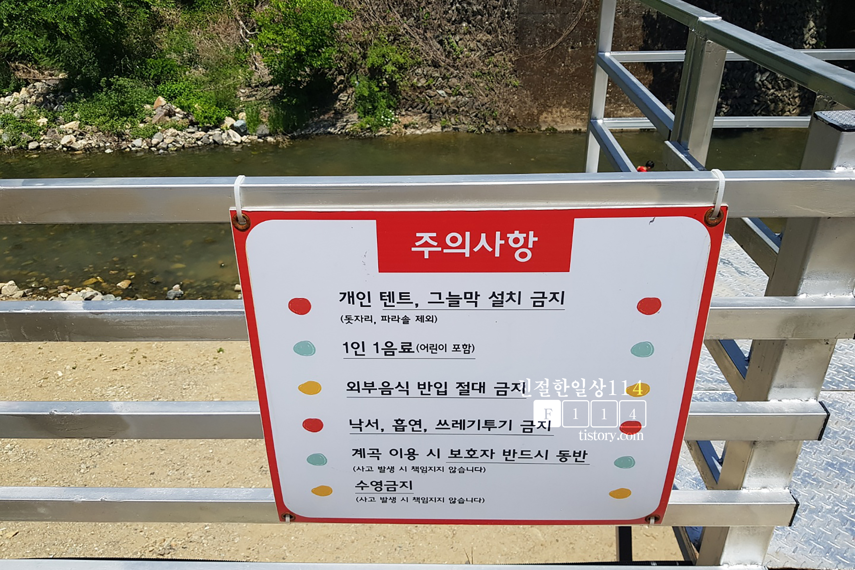 계곡에 내려가기전 난간에 붙어있는 주의사항을 읽어본다. 개인텐트, 그늘막 설치 금지! 돗자리와 파라솔은 펼 수 있다.