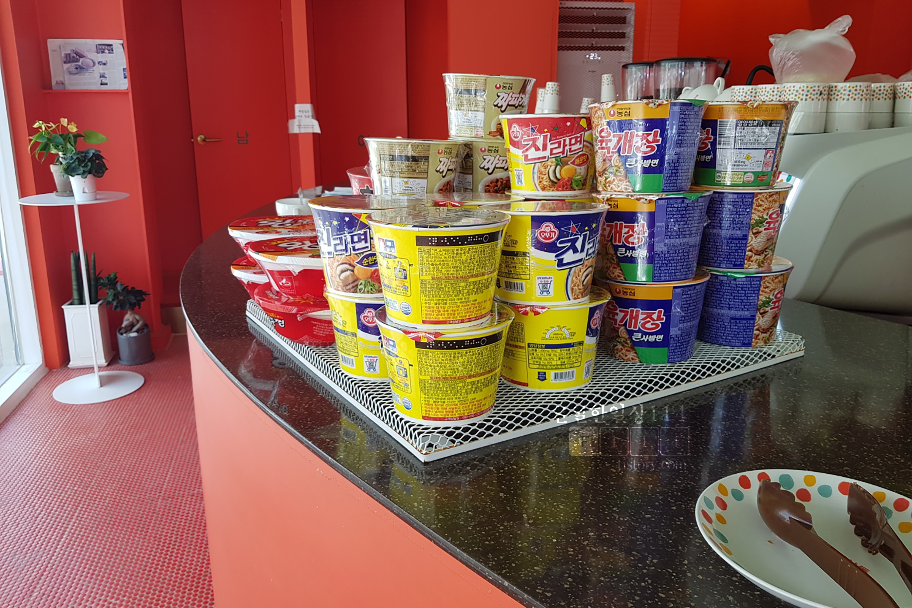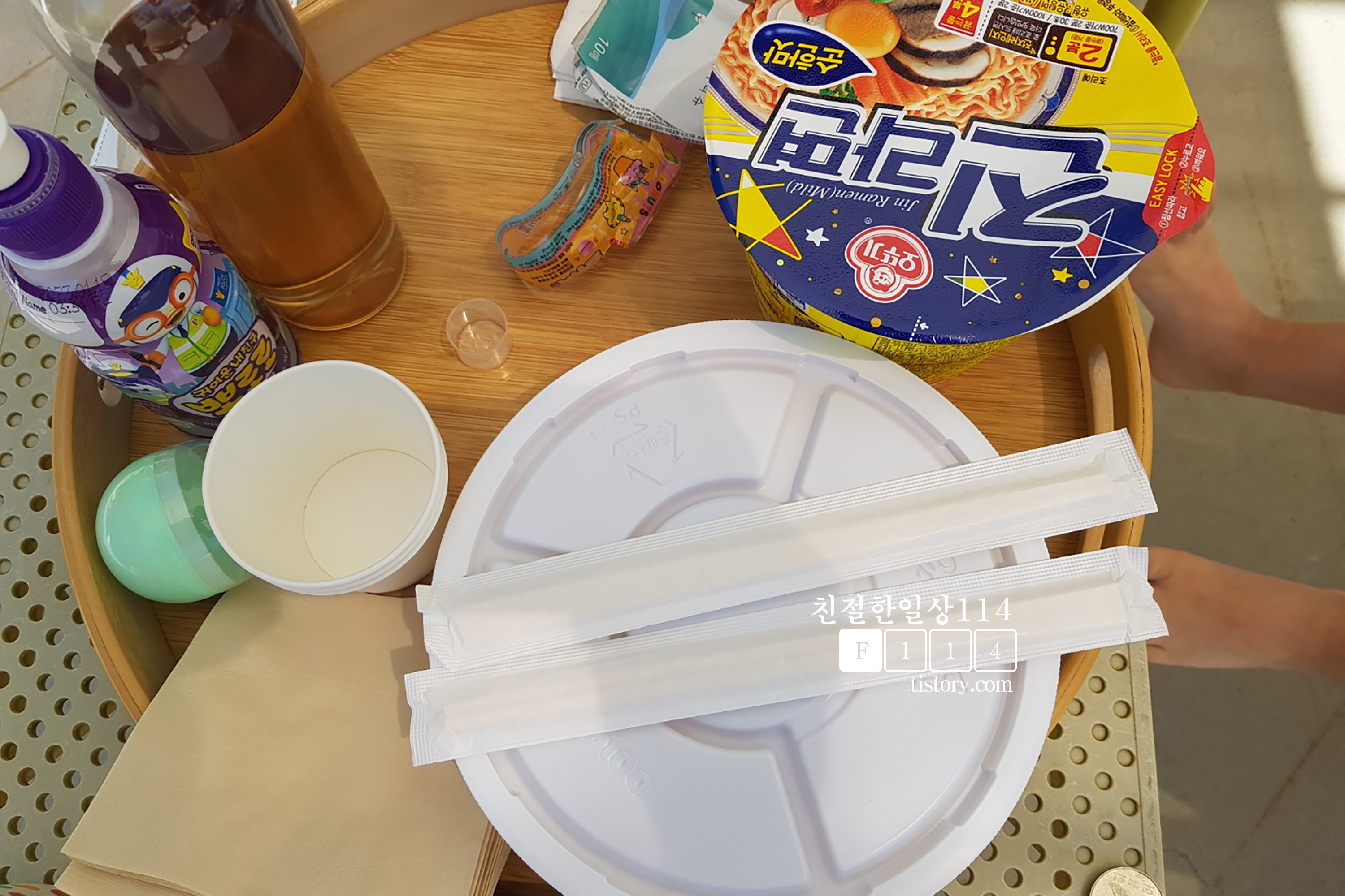 컵라면과 베이커리류도 있다. 컵라면은 왕뚜껑과 진라면을 사먹었는데 7,000원 이었다. 가격이 1개당 3,500원 인가 보다. 컵라면을 사면 물을 부어서 젓가락과 함께 쟁반에 올려서 준다.
