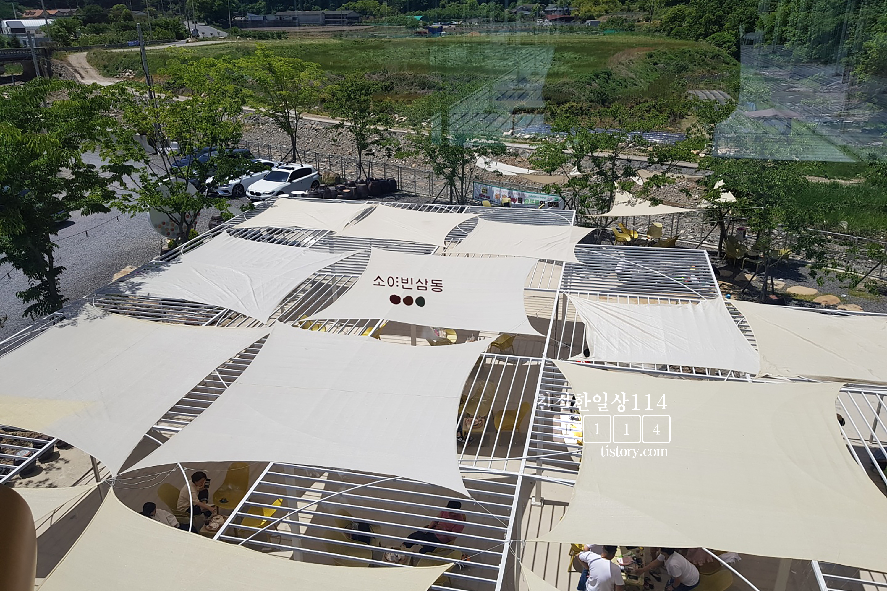 3층에서 카페 마당쪽으로 내려다보면 기저귀를 널어놓은 듯? 시원 상쾌한 경관을 볼 수 있다.