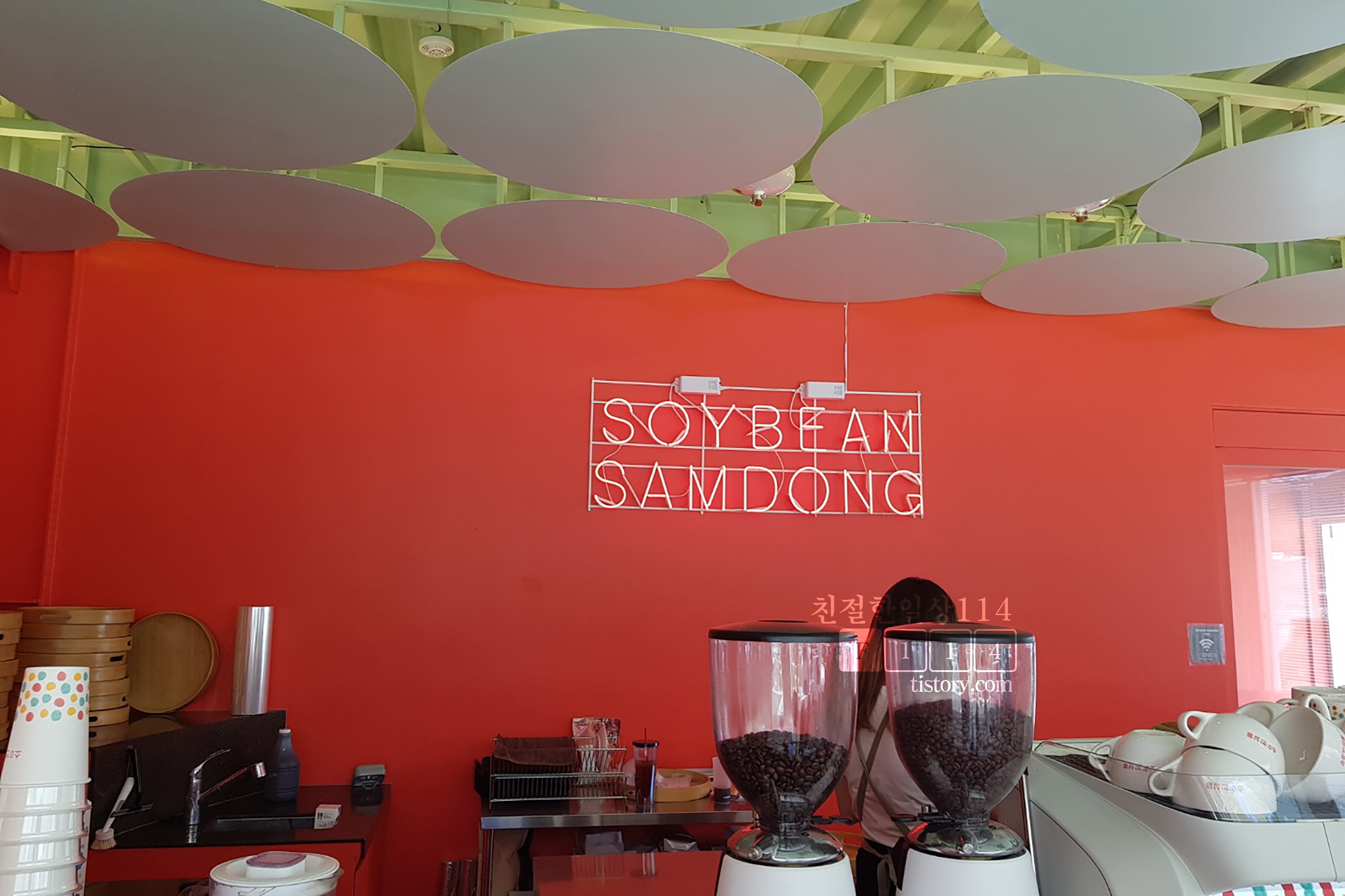 건물로 들어서면 빨간색으로 꾸며진 내부가 보인다. 카운터가 보이고 카운터 맞은편에는 카페에서 직접만든 각종 콩 제품들이 진열 & 판매중이다. 어린이 음료수와 맥주도 보인다.