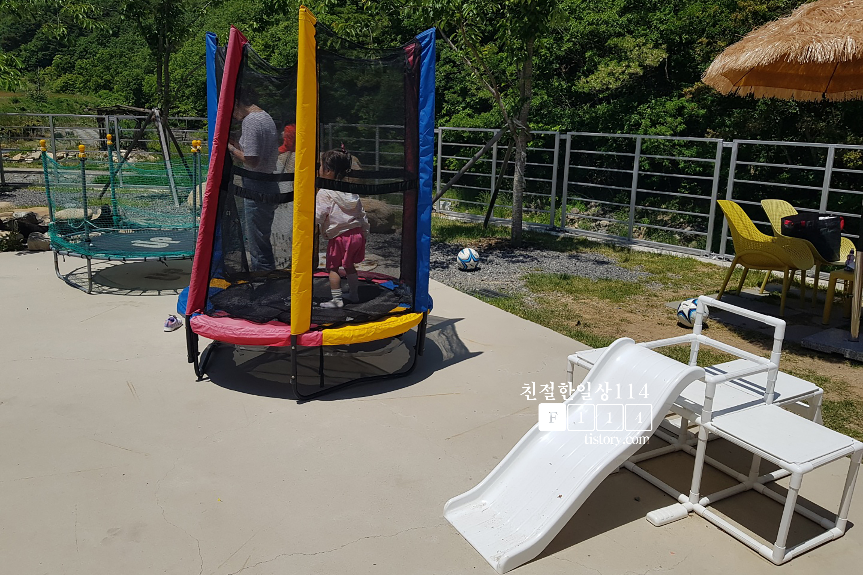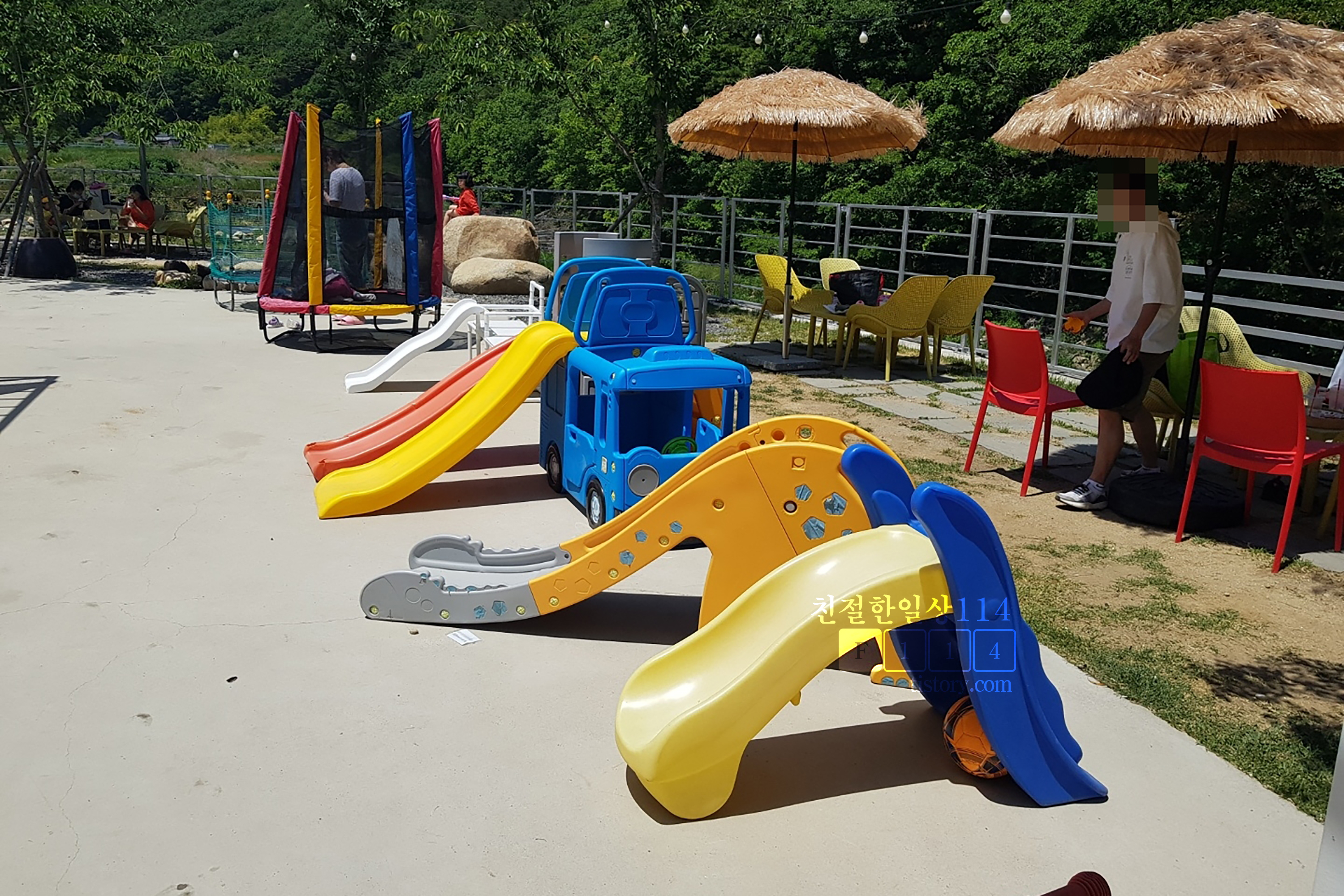 작은 트램벌린도 2개가 있고 미끄럼틀도 여러개가 있다.
