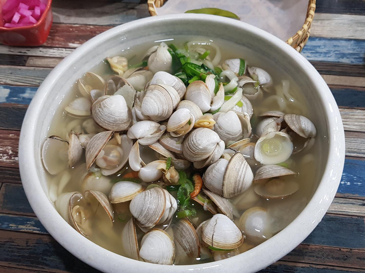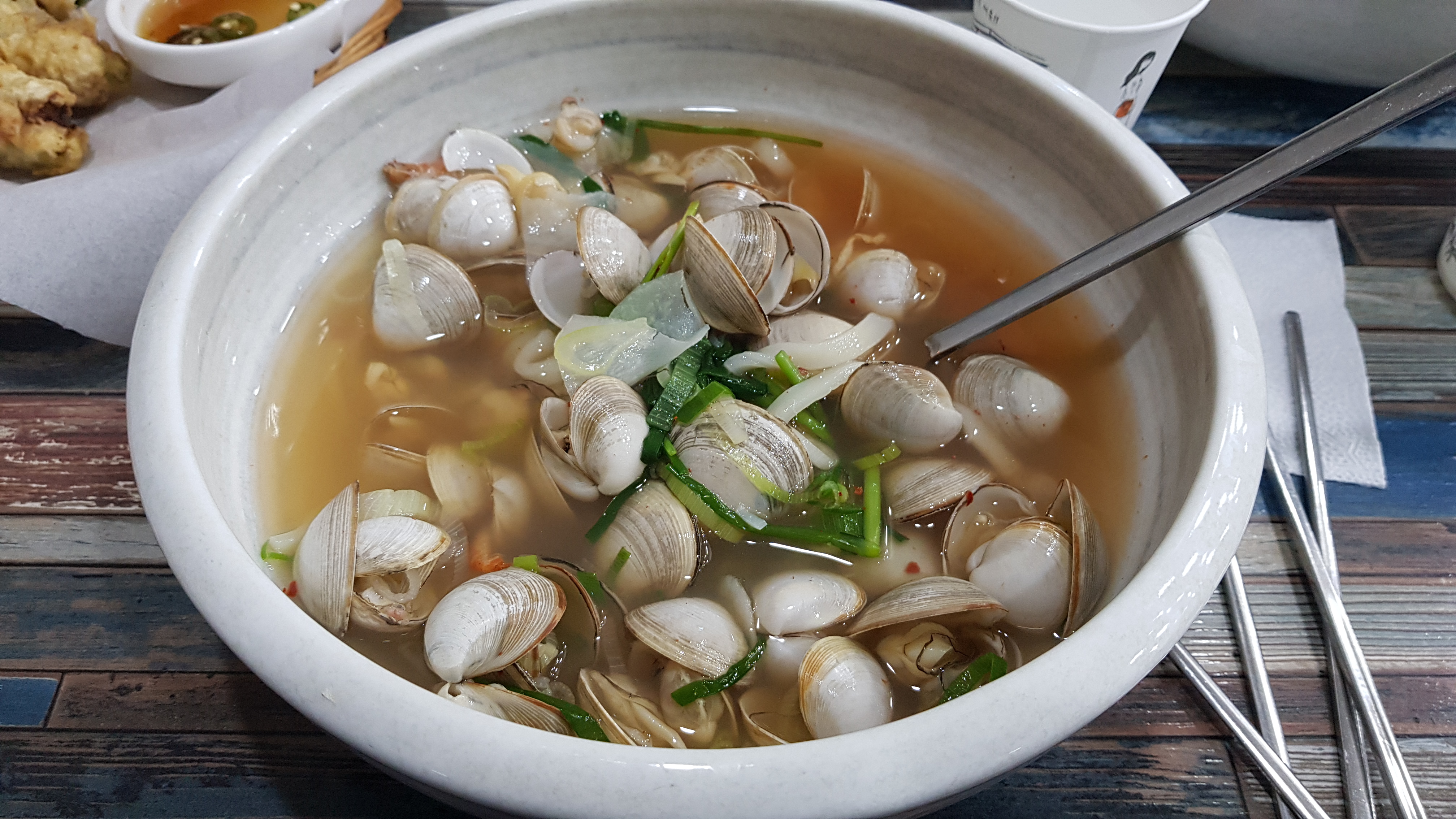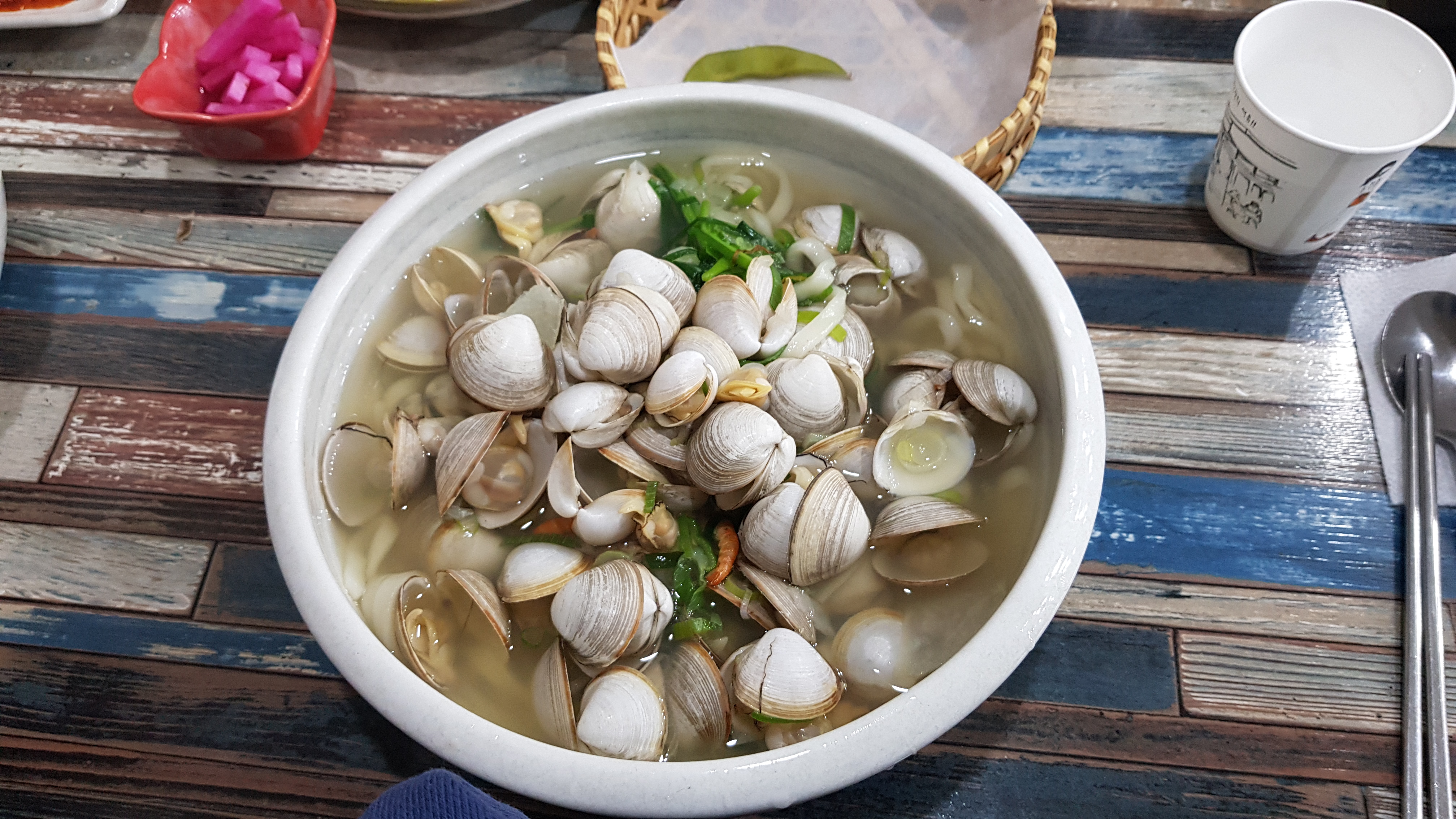 주문한 해물칼국수와 고추튀김이 나왔다. 역시나 동죽조개가 그릇밖으로 솟아올라있다.