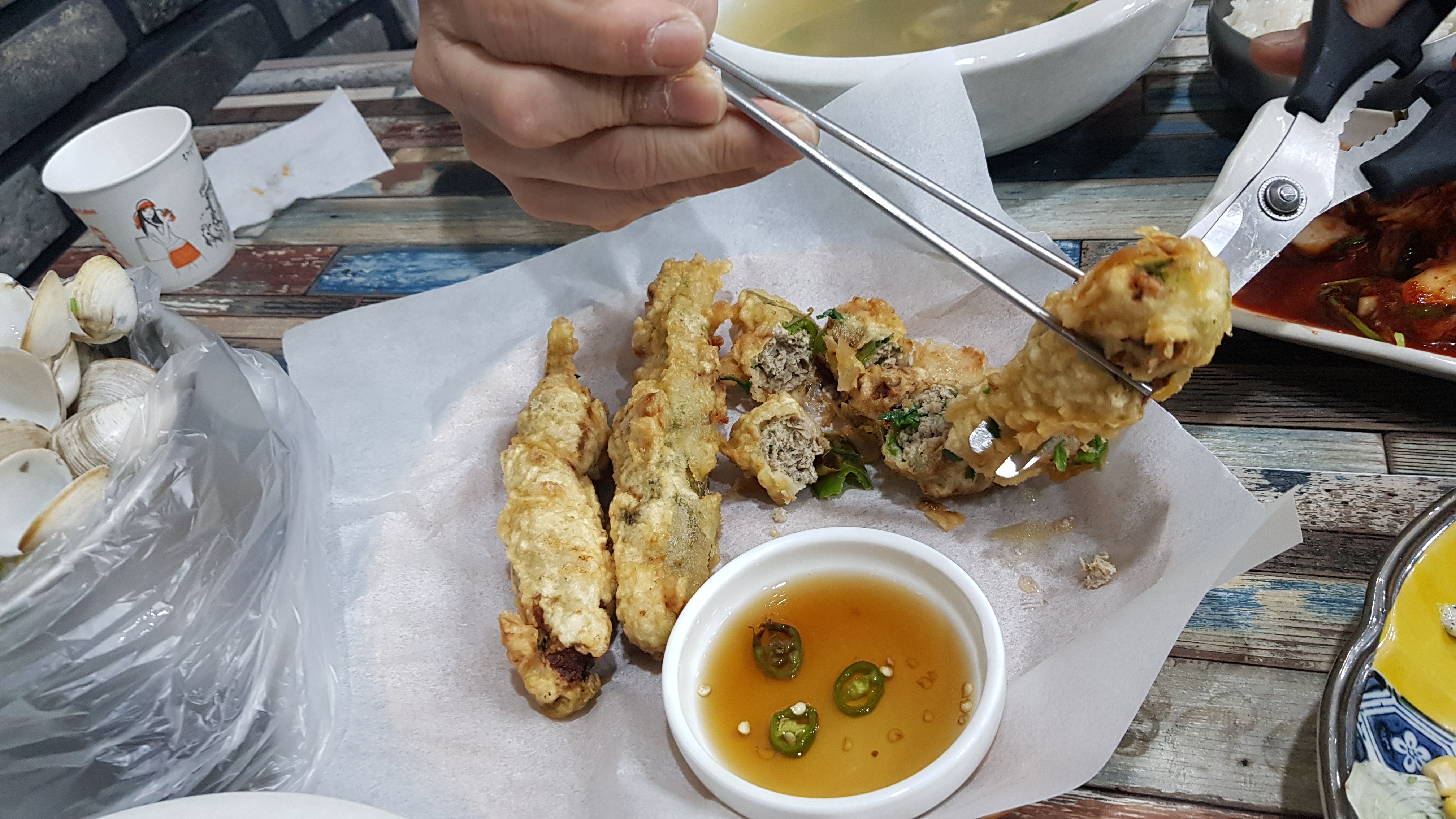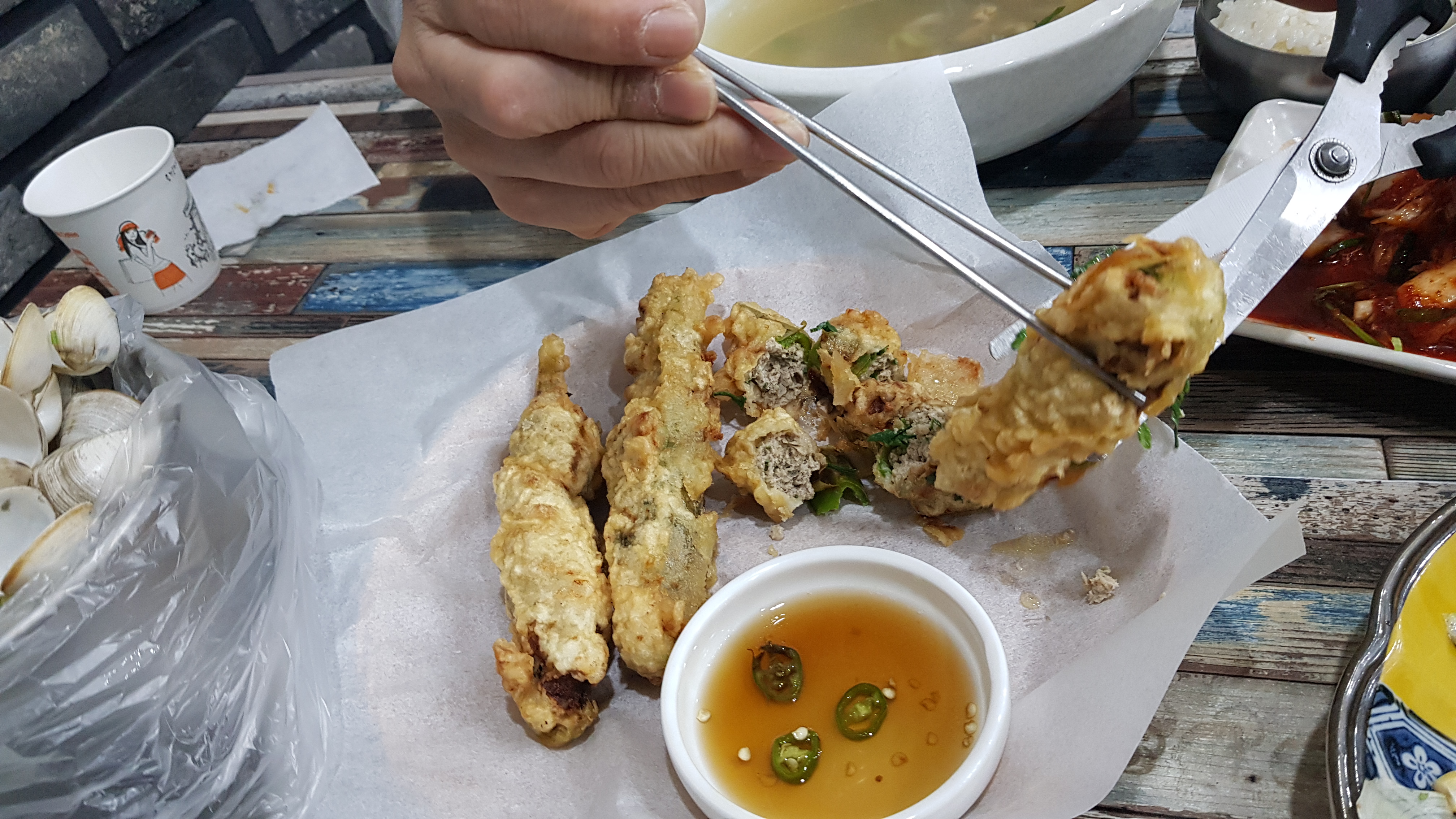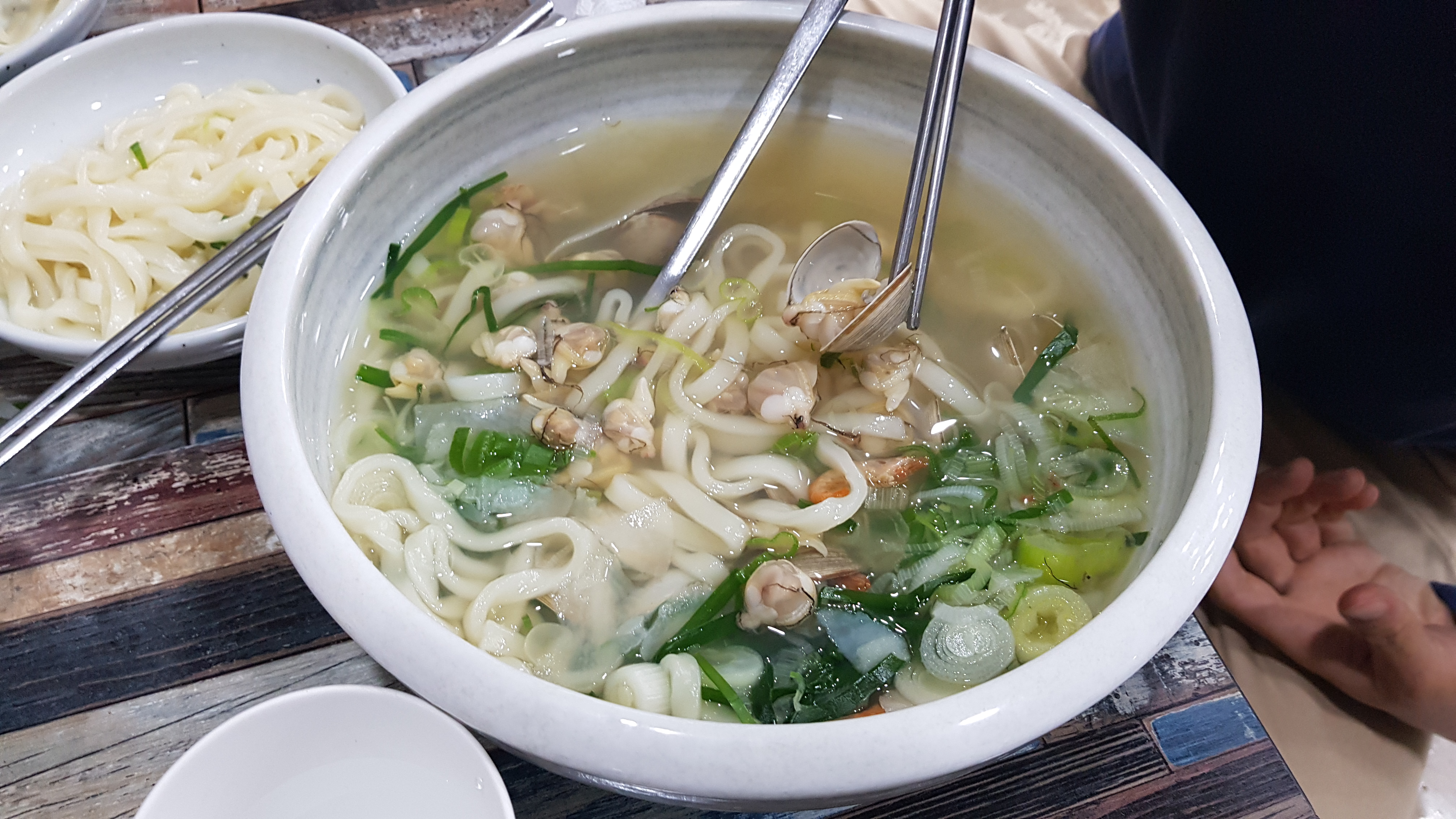 주문한 해물칼국수와 고추튀김이 나왔다. 역시나 동죽조개가 그릇밖으로 솟아올라있다.