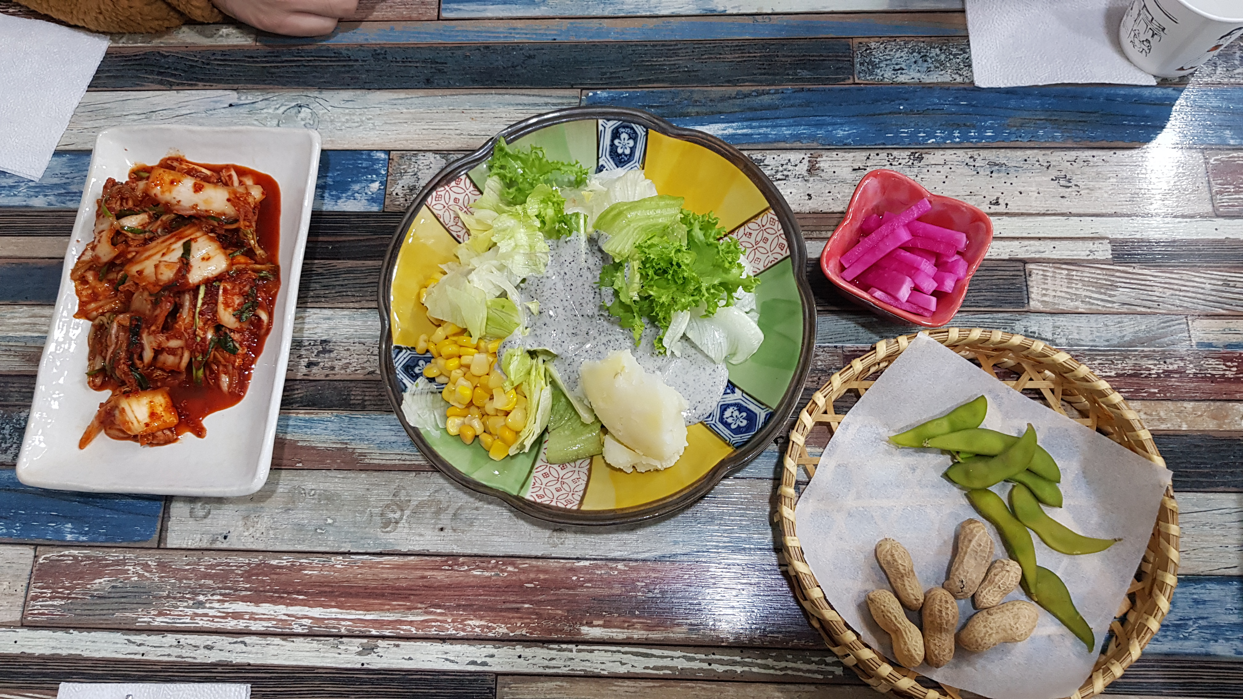 자리에 앉자마자 이렇게 김치와 샐러드, 피클, 땅콩과 완두콩이 나온다. 이 웰컴 밑반찬을 먹고 있자면 음식이 나올때 까지 기다림의 초조함을 상쇄시킬 수 있다.