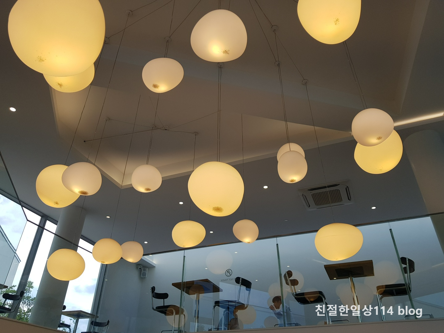 중정을 지나 카운터를 찾아내고 주문을 한다. 그리고 자리를 찾아 이층으로 올라가는 도중에 보이는 풍등 같은 조명이 보인다.