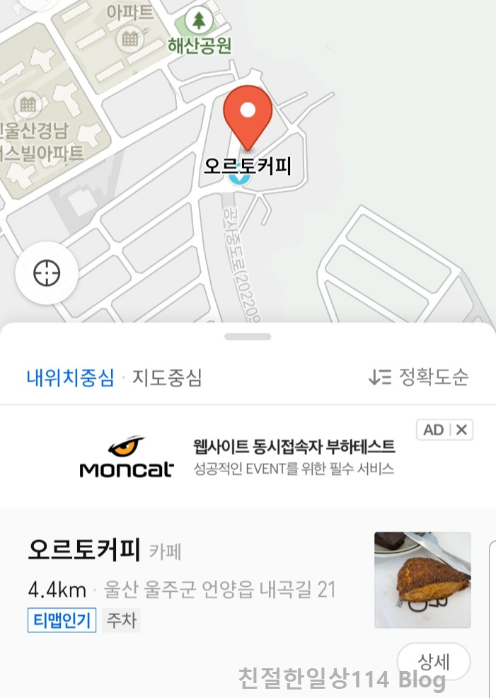 차를 타고 가기 위해 네비를 켜고 오르토코피를 검색해보니 티맵인기장소로 뜬다. ‘맛있는 카페를제대로 찾은건가?’ 싶은 생각에 가는 길이 설렌다.
