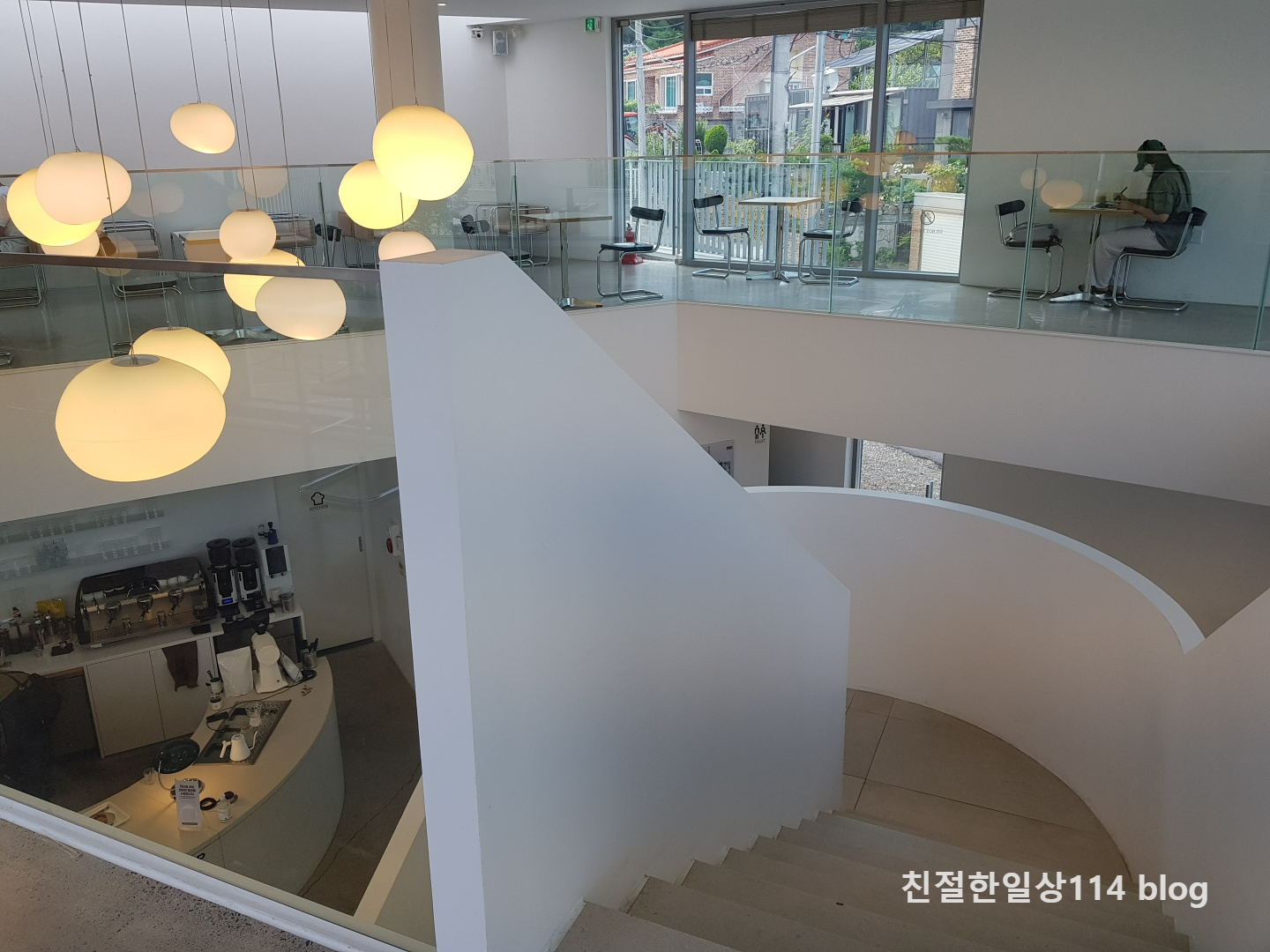 생각지 못 했던 실내 공간 디자인에 여기저기 둘러보느라 눈이 바빴다. 건물에 들어서 바로 보이는 의외의 중정과 귀여우면서도 따뜻한 느낌의 조명, 그리고 백색의 나선형 계단까지 시선을 사로잡는 포인트가 많아 눈이 즐거웠고 사진에 담느라 손이 바빴다. 하지만 휘낭시에와 커피는 기대를 많이 했던 탓인가 반짝하는 맛을 느끼지는 못 했다. 기대를 많이 했던 것이지 맛이 못 한것은 아니기에 오해 없기를.. 바닐라라떼에 올려져 있던 커피큐빅은 커피를 마지막까지 농도있게 즐기게 해주는 센스와 세심함을 느낄 수 있었다. 의외에 즐거움을 선사해주었던 오르토커피 방문 후기는 여기까지 담아보며 글을 마친다.