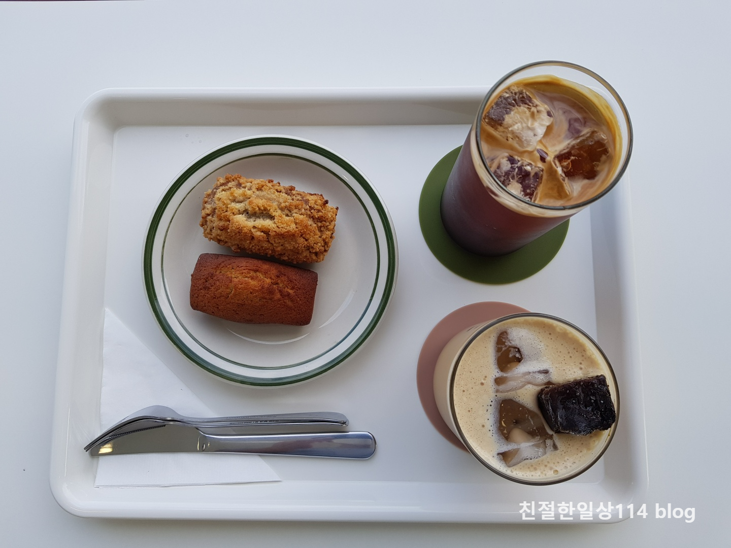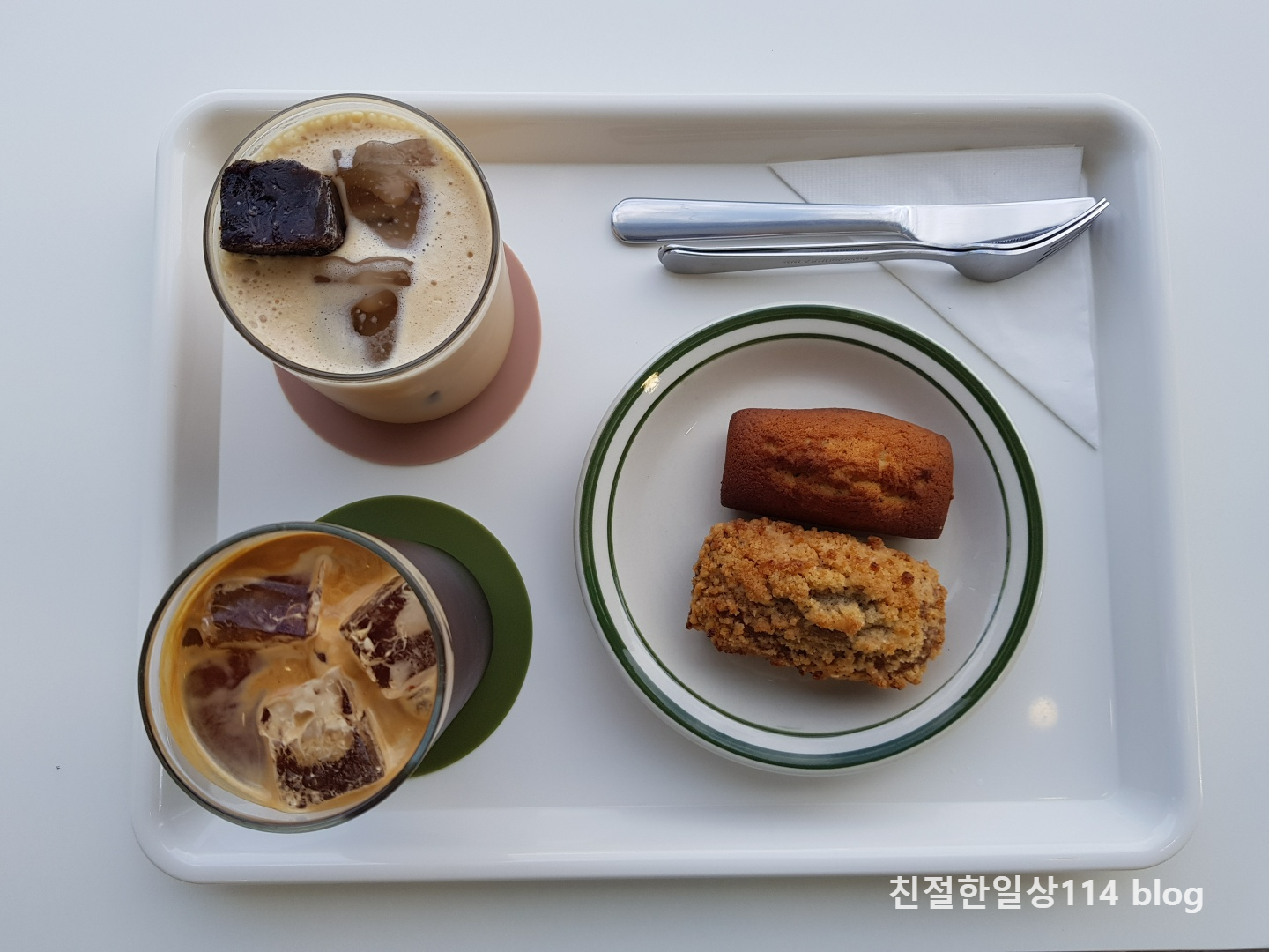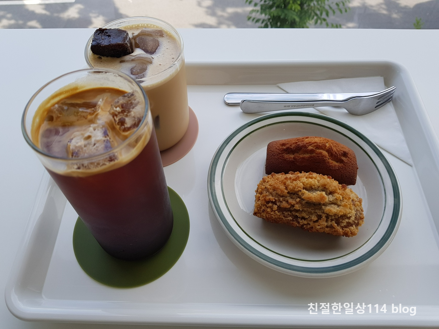 주문 후 이층에 자리를 잡고 있으니 진동벨이 울린다. 흰색 쟁반에 가지런히 담긴 커피와 휘낭시에가 보기 좋게 올려져있다.