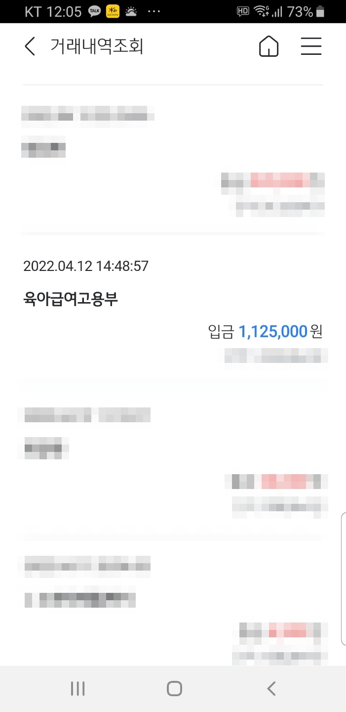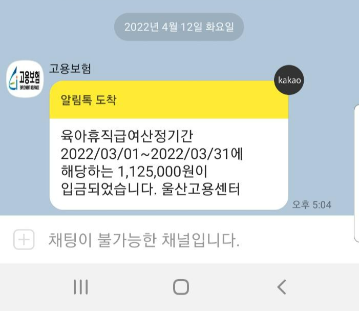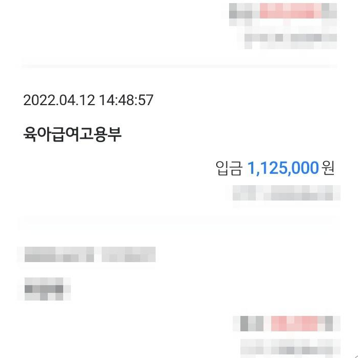 그리고 4월 12일 등록해둔 계좌로 1,125,000원의 육아휴직급여가 입금되었다.