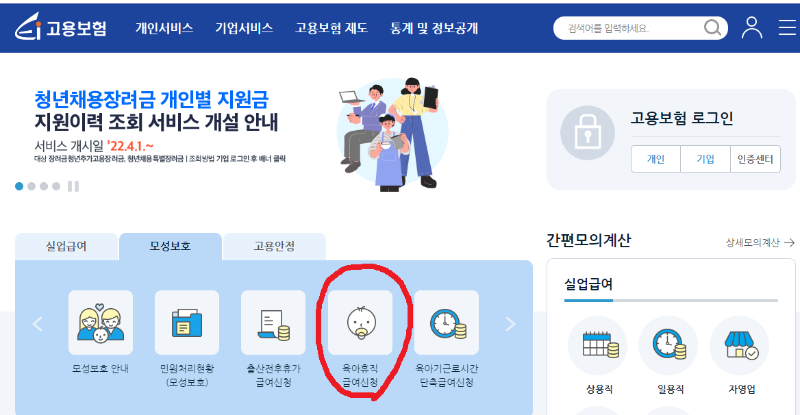 설명을 듣고 표로 봐서는 어렵고 잘 모를 수도 있다. 고용보험사이트에서 제공하는 육아휴직급여 모의 계산기를 이용해 내 급여와 상황에 맞는 육아휴직급여를 계산해볼 수 있으니 이용해 보자.