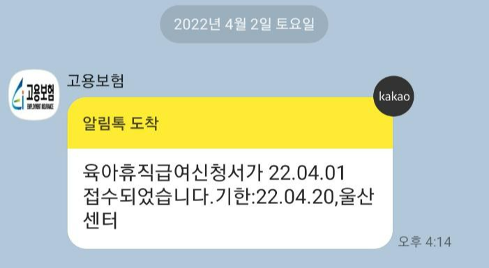 3월 육아휴직 급여를 4월의 첫날인 1일에 고용보험 사이트에서 신청을 했고 접수되었다는 알림톡이 다음날에 왔다.