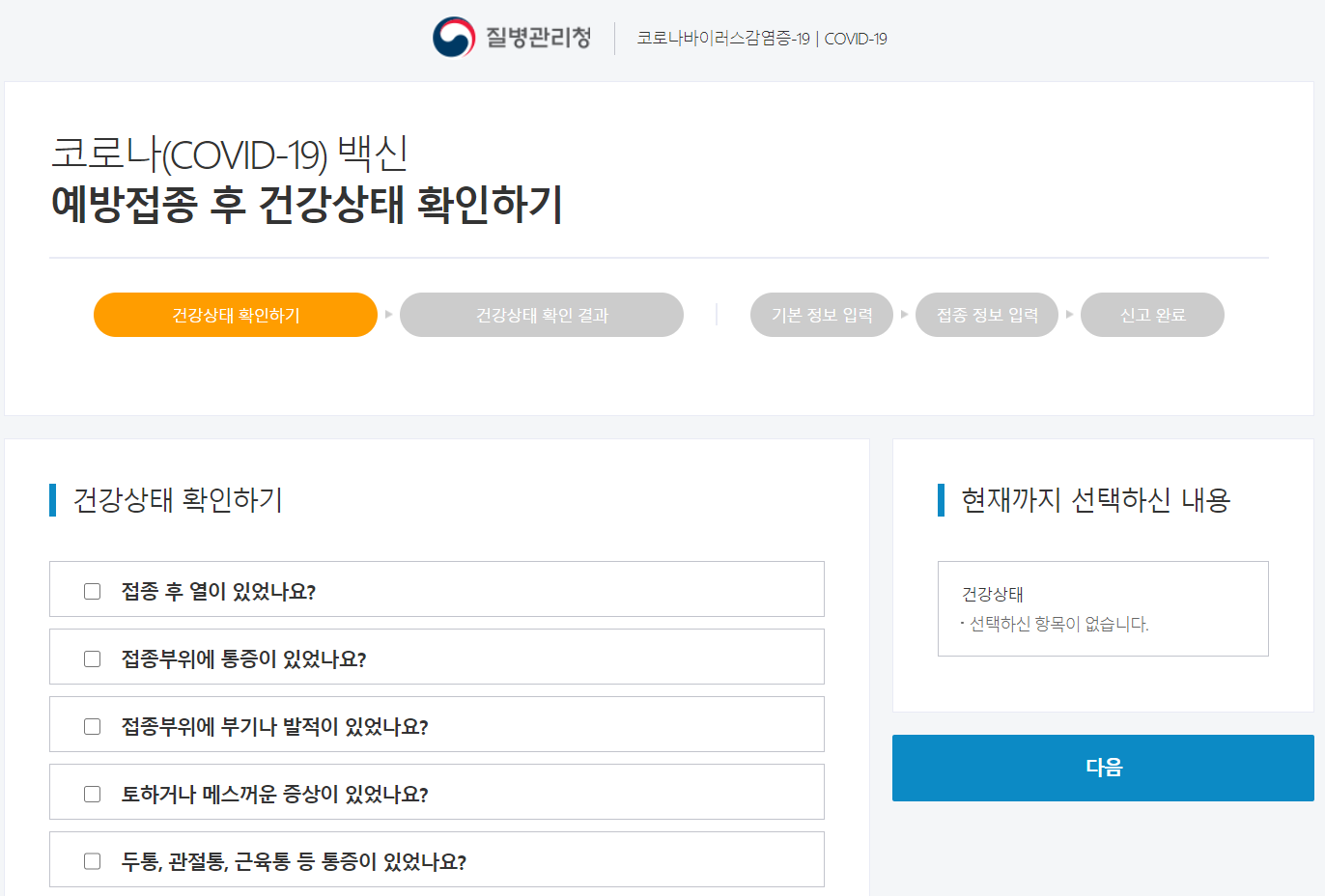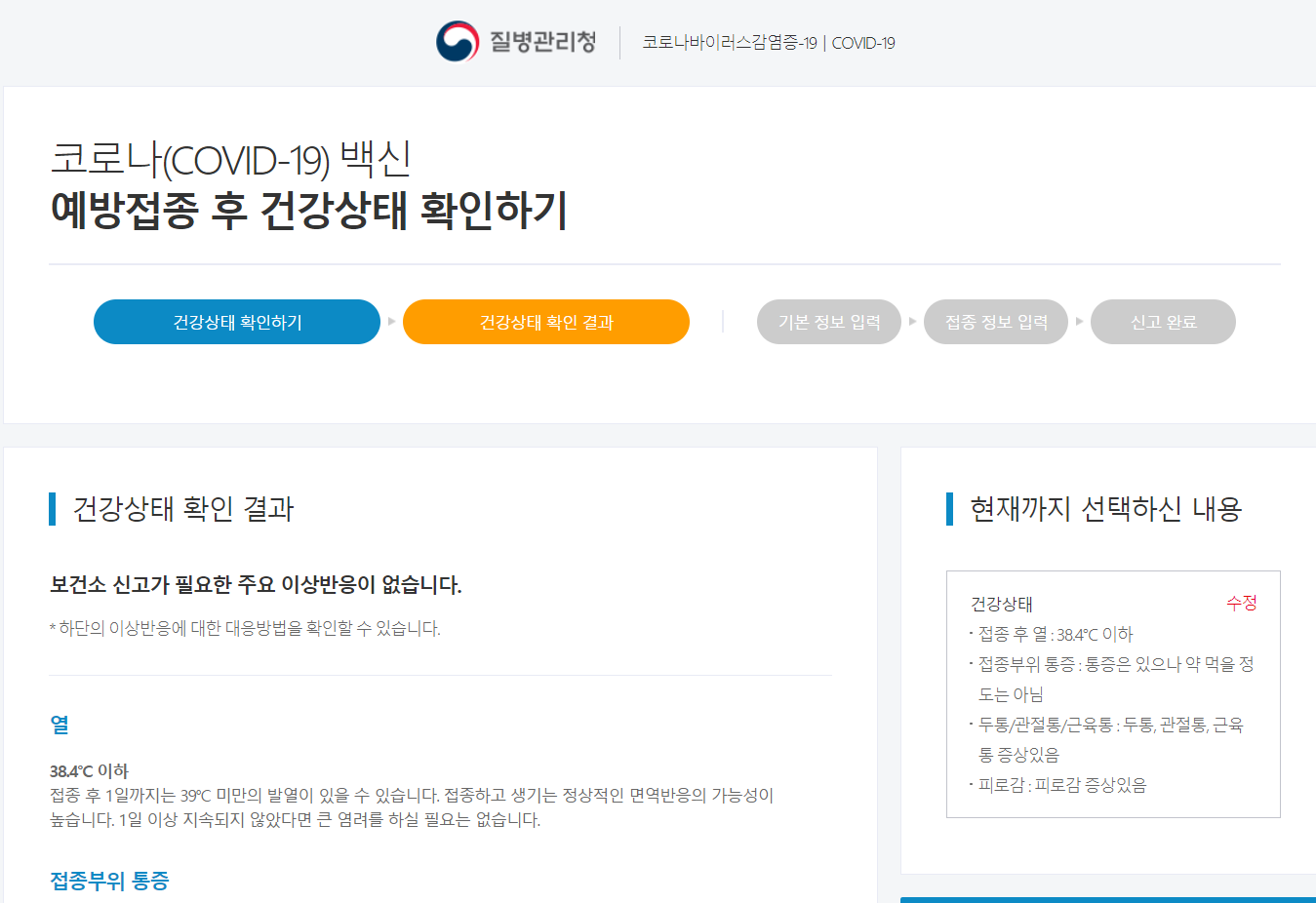 질병관리청에서 운영하고 있는 예방접종 후 본인이게 나타나는 증상을 체크하고 필요한 조치를 안내 받을 수 있는 사이트가 있으므로 접종 후 필요시 이용하면 좋겠다.