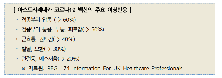 ▶접종 후 예상가능한 국소반응으로 접종부위 통증, 붓기, 발적 등이 있으며 / 전신반응으로 발열, 피로, 두통, 근육통, 구역, 구토 등이 나타날 수 있다.