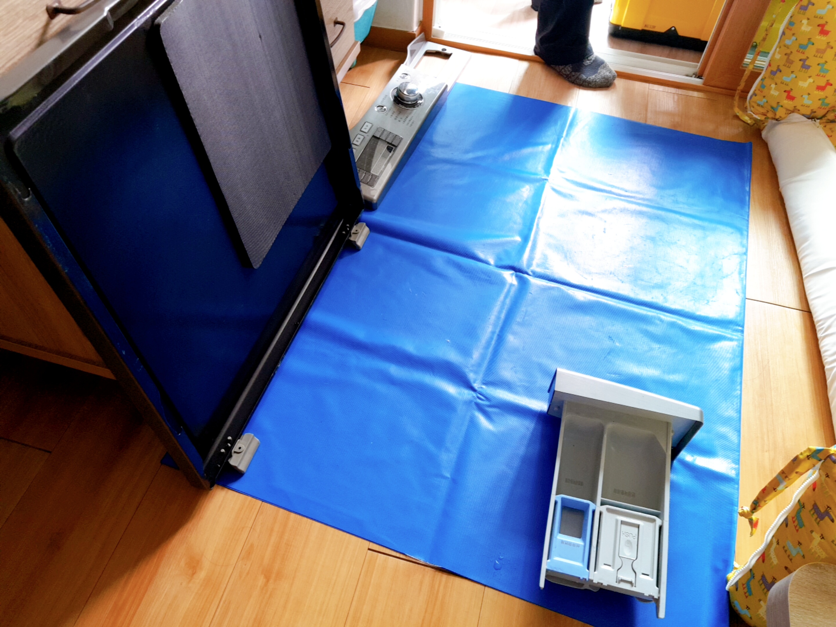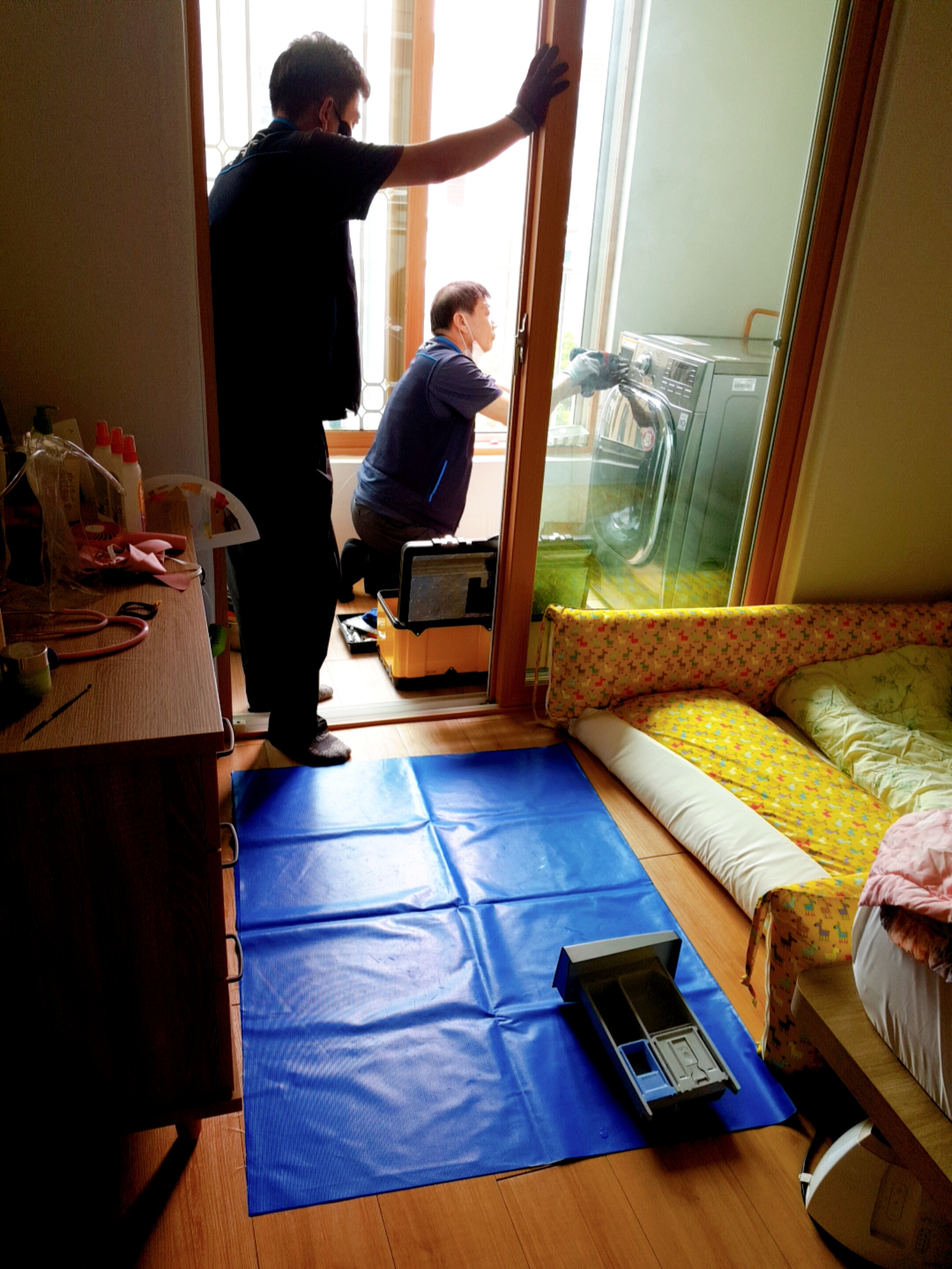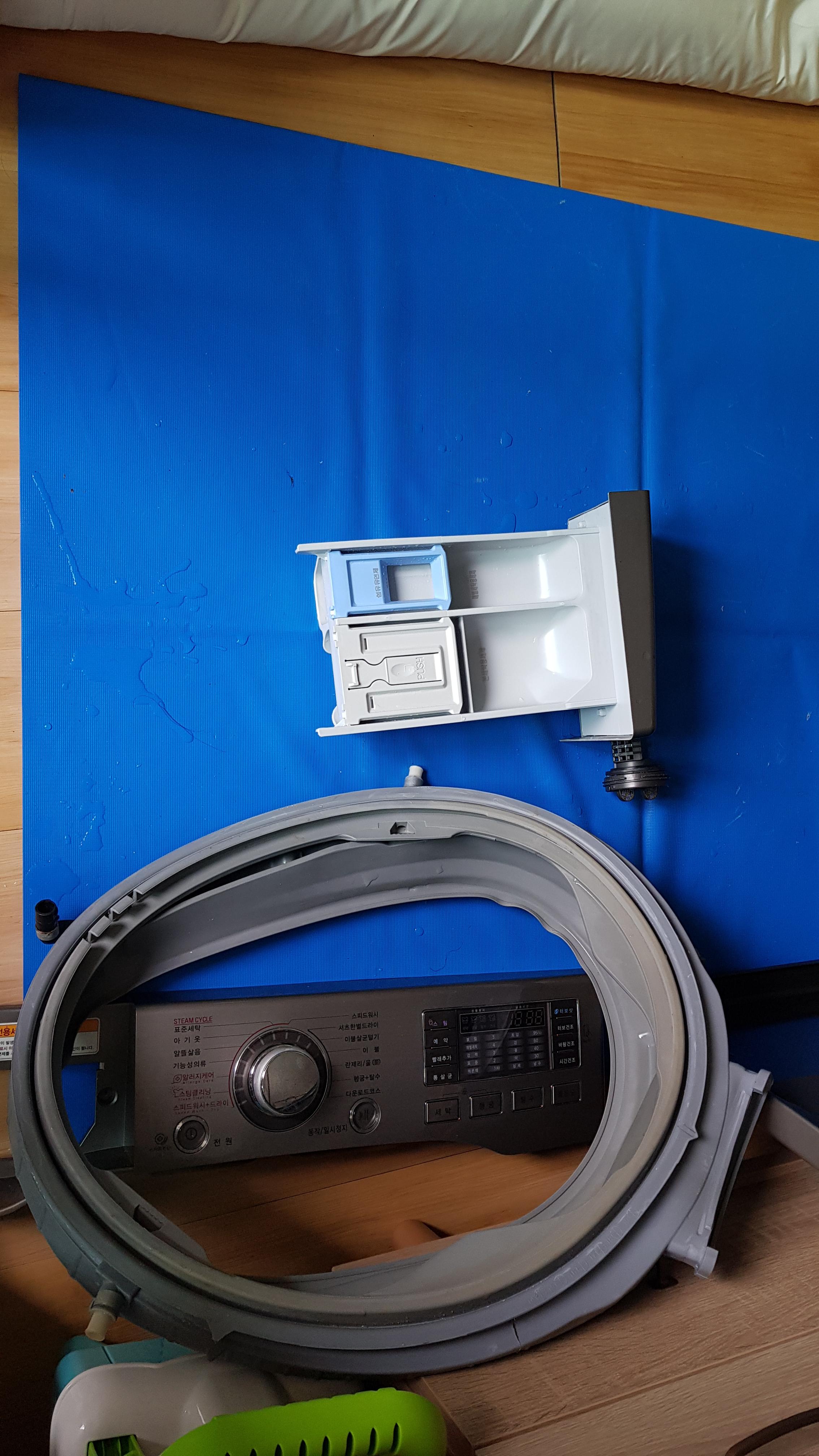 세탁기 청소 작업은 두명이서 하며 청소시간은 1시간 30분 정도가 걸렸다. 분해한 세탁기 부품들은 준비해온 천막을 바닥에 깔고 올려둔다.