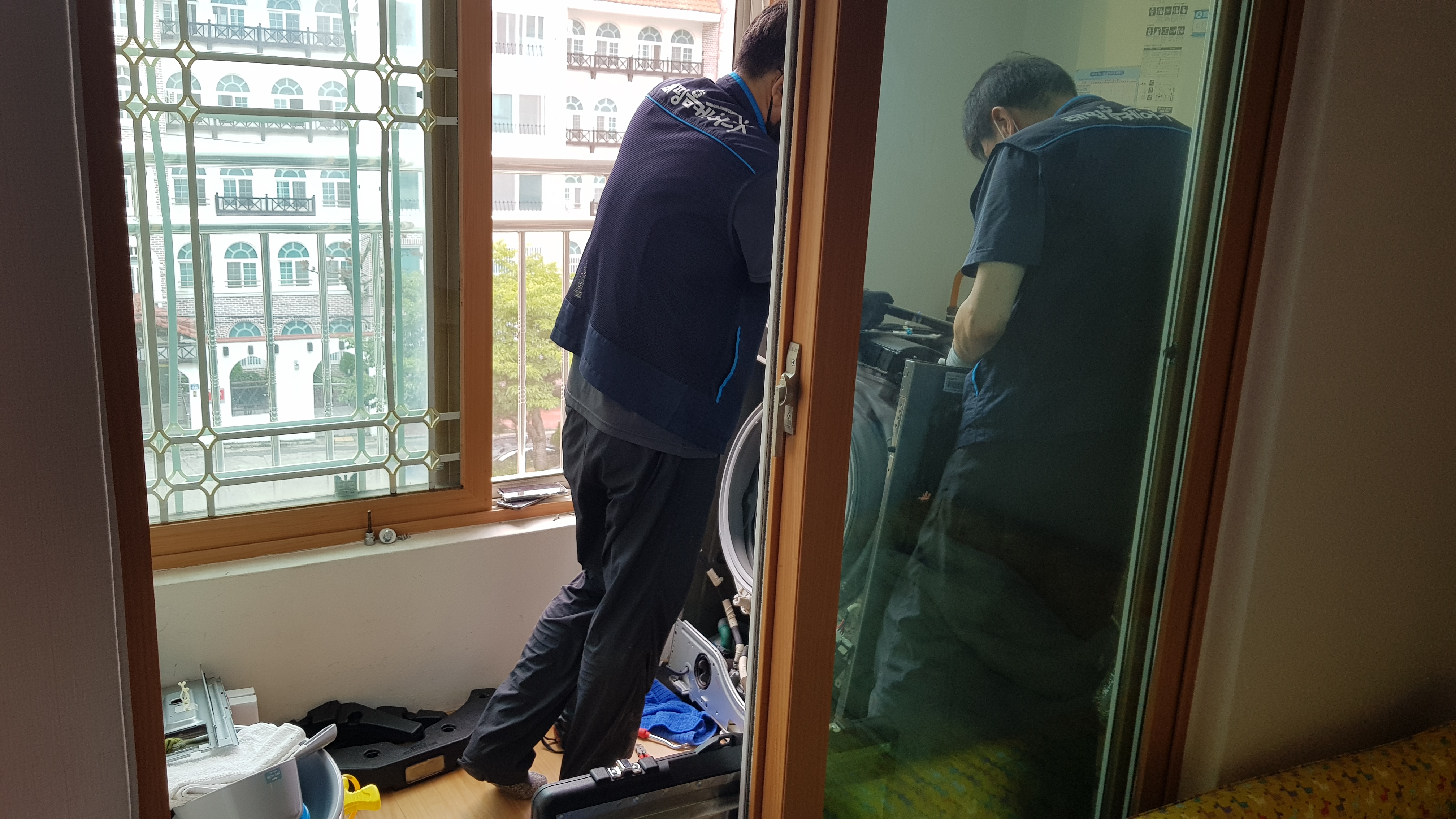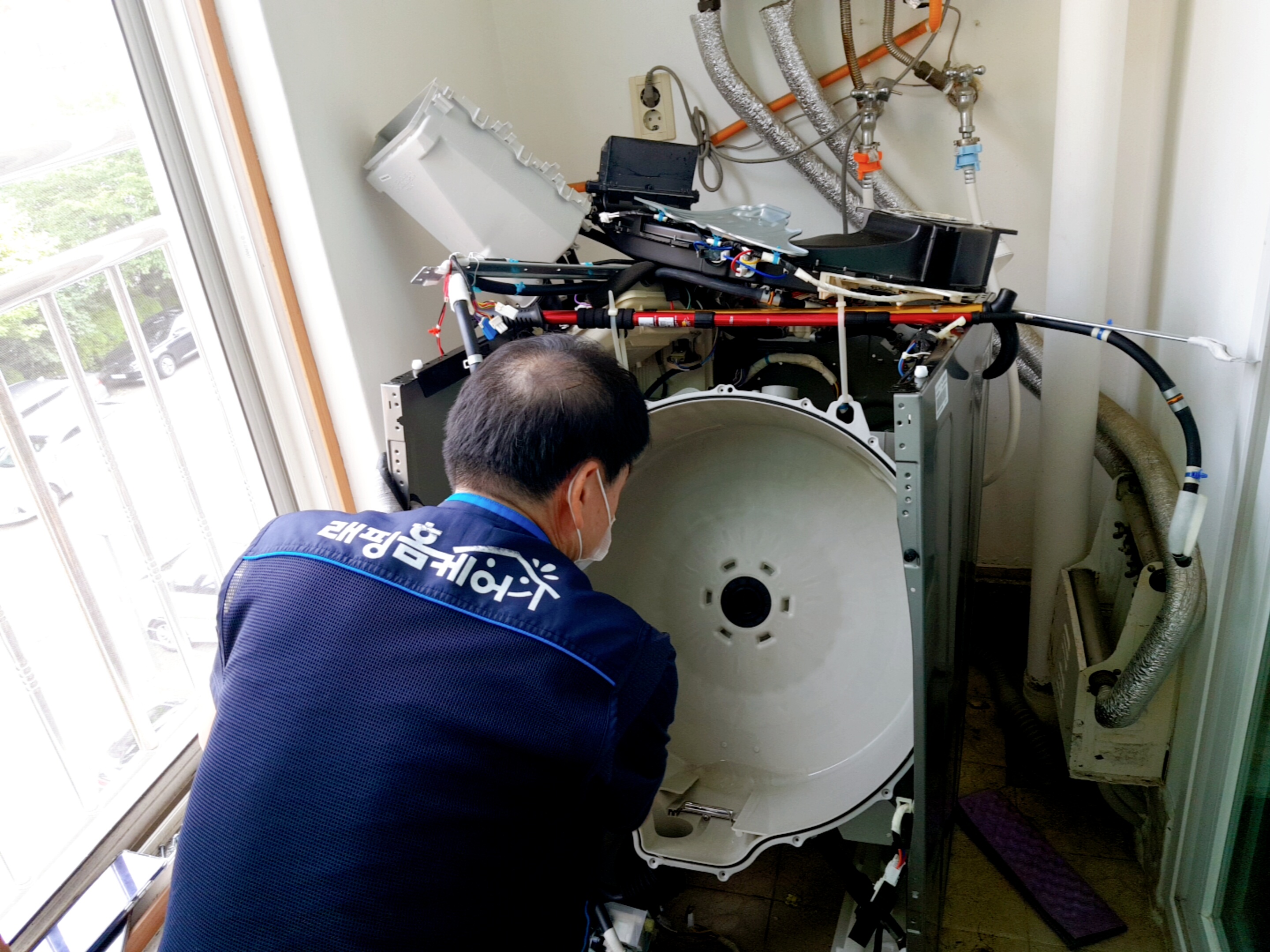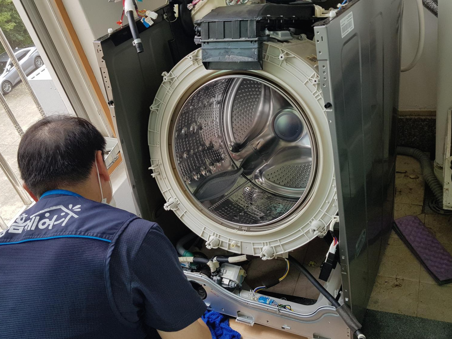세탁기 청소 작업은 두명이서 하며 청소시간은 1시간 30분 정도가 걸렸다. 분해한 세탁기 부품들은 준비해온 천막을 바닥에 깔고 올려둔다.