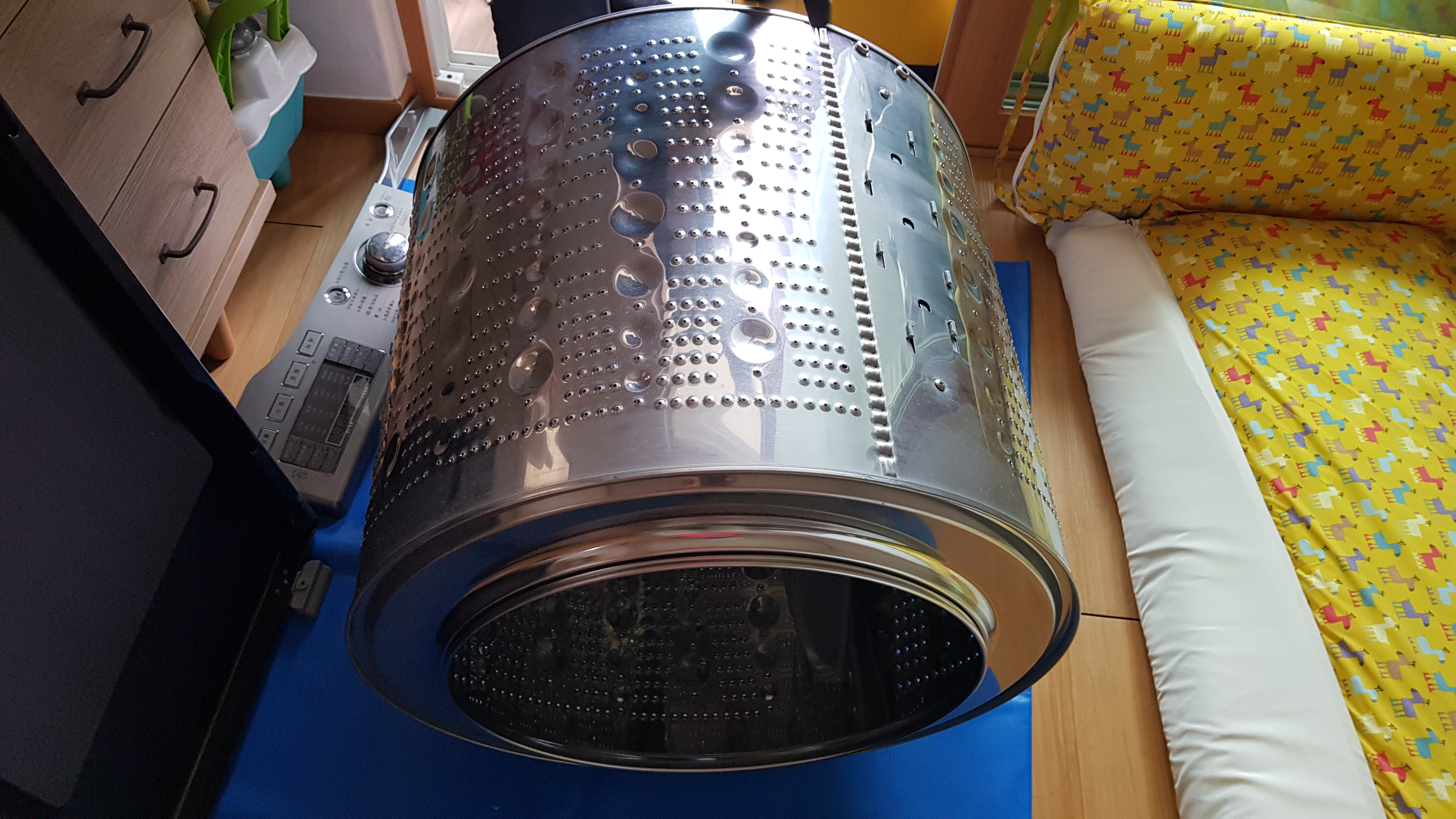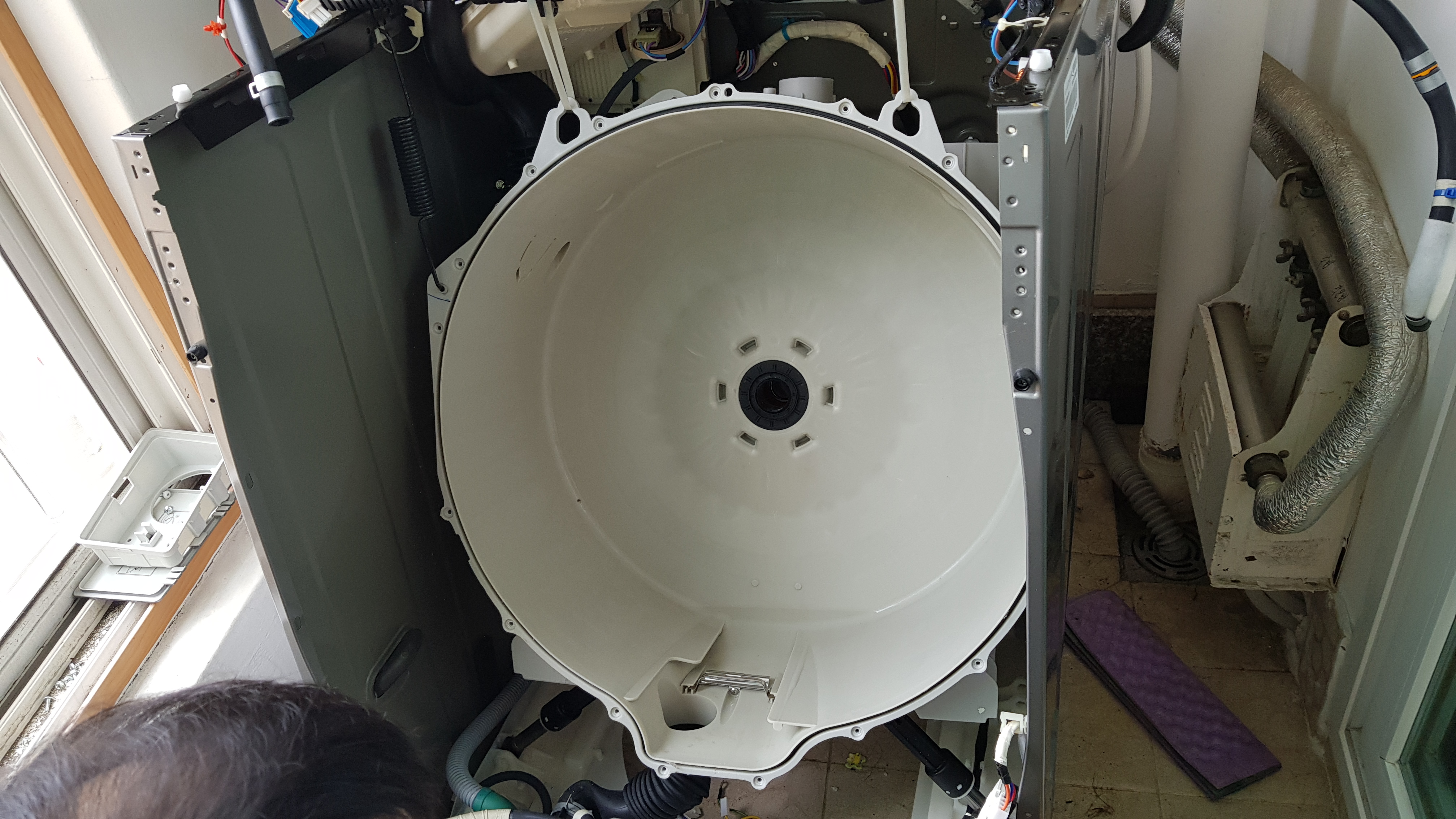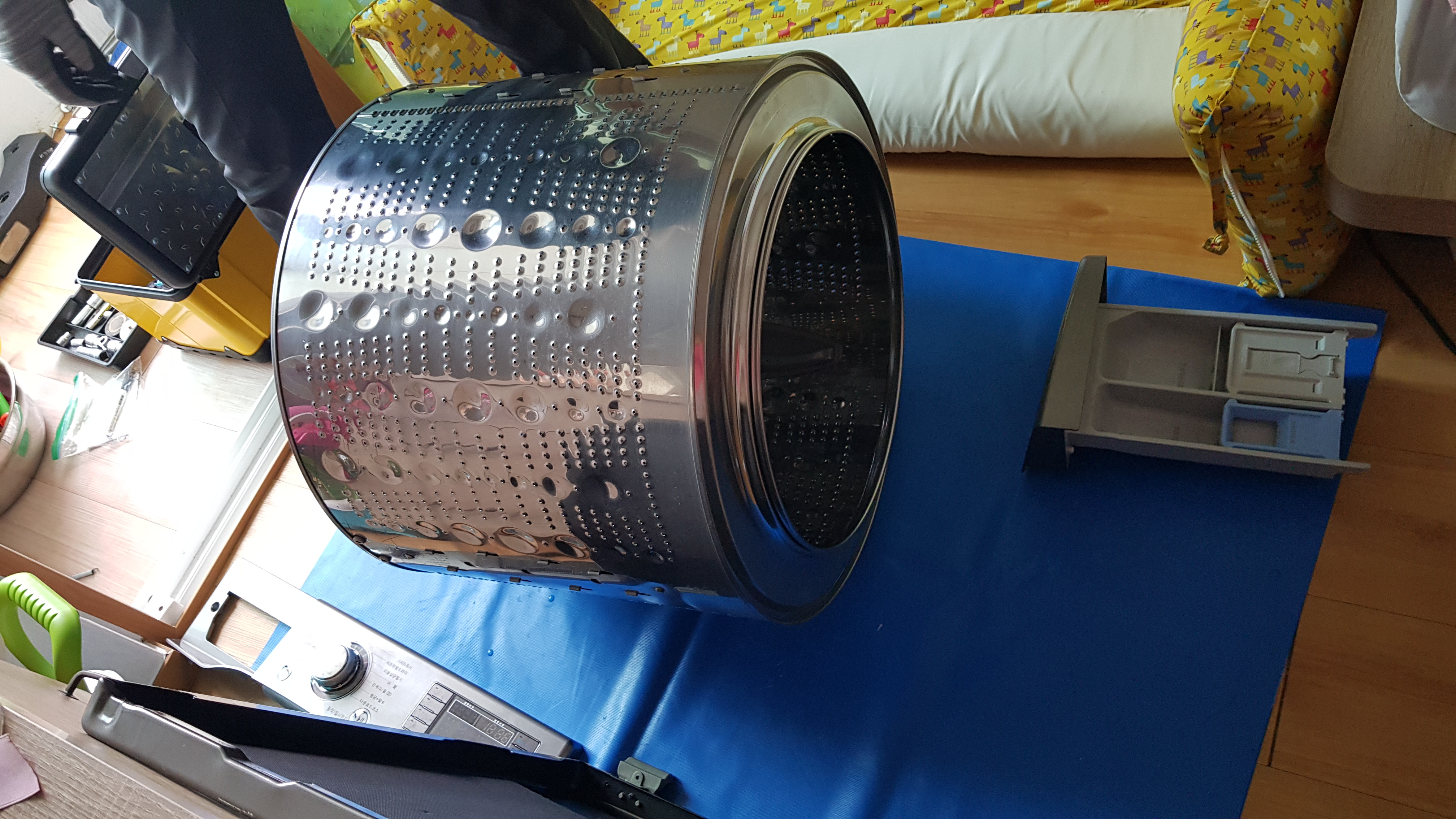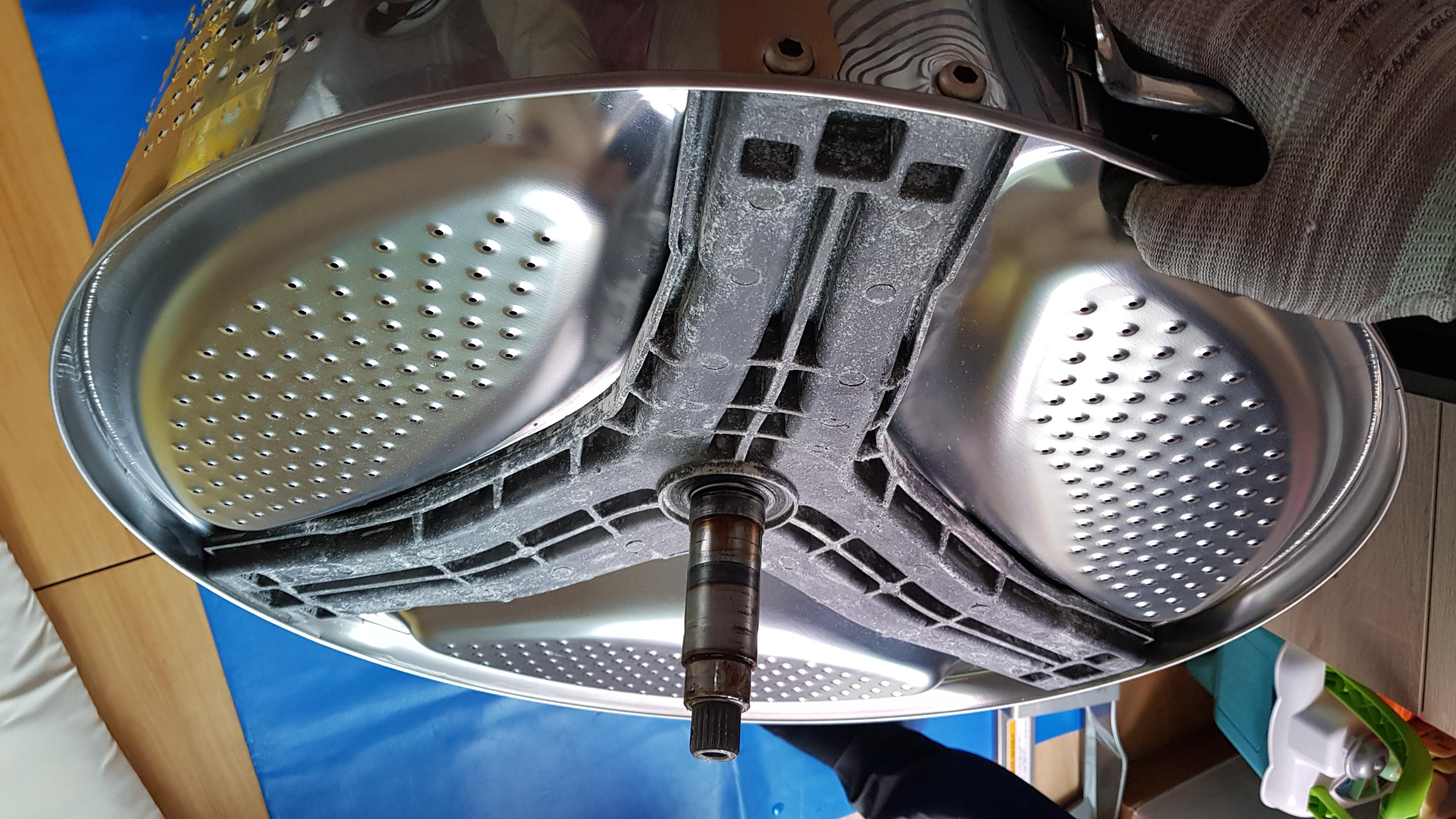 세탁기 문을 떼어내고 다음은 드럼통을 들어낼 차례인가 보다.