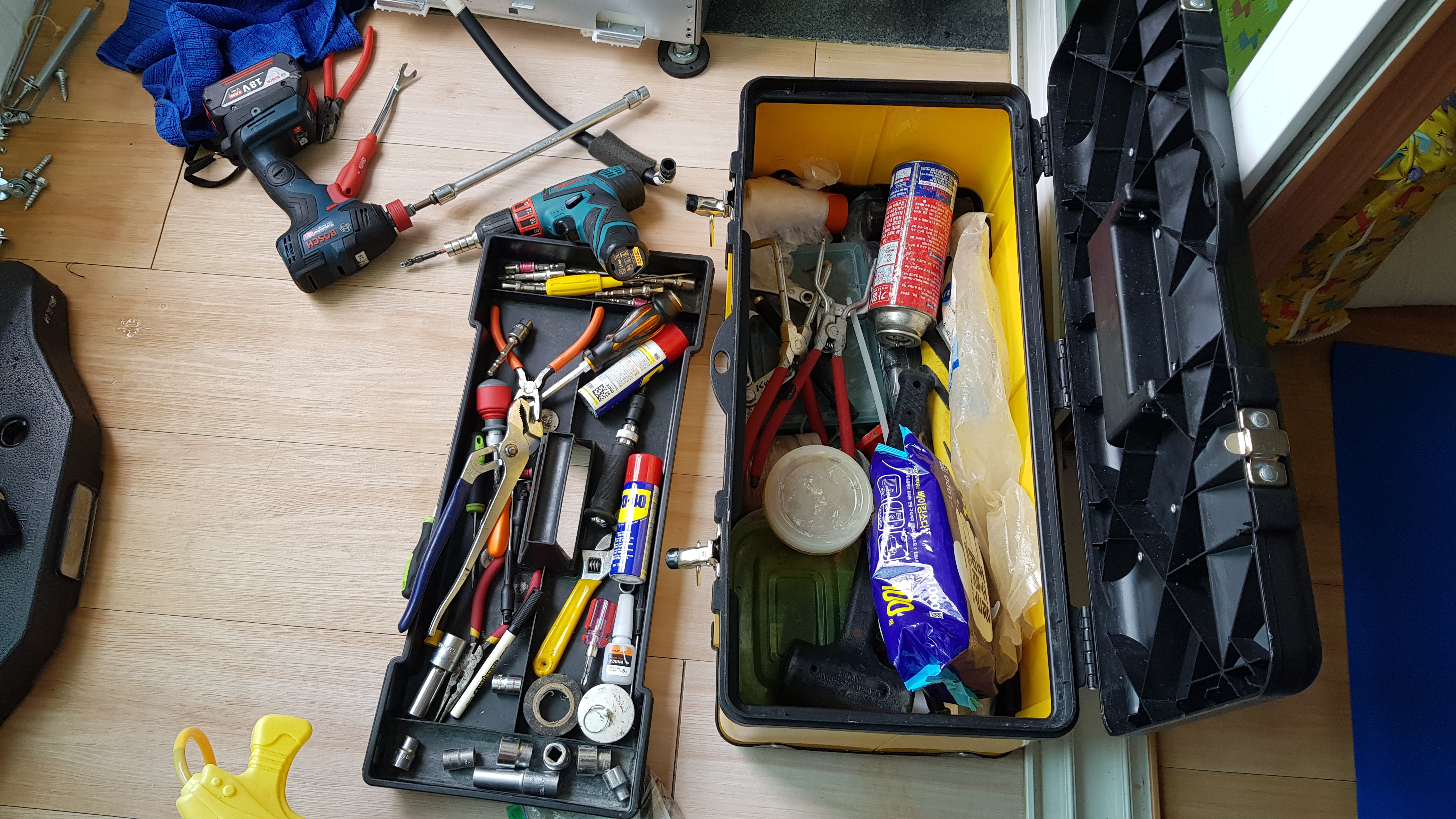 세탁기 청소를 위해 가져온 도구를 보니 청소도구뿐만 아니라 세탁기 분해를 위해서 각종 공구도 준비해 왔다.