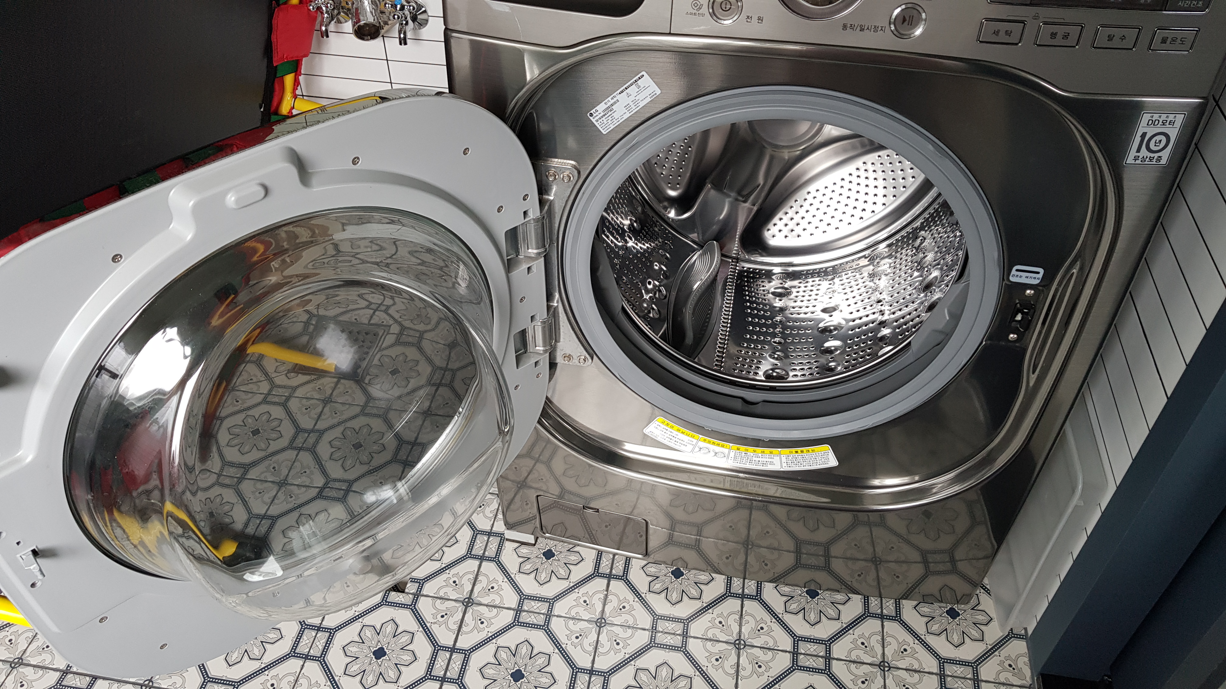 분해한 드럼과 같은 세탁부품은 화장실에서 고압분사기로 청소를 하기때문에 세탁기에 붙어있는 찌든때가 벽면에 튈 수 있어서 청소하는 동안에 화장실 문은 닫아둔다. 그리고 청소 후 혹시 화장실 벽면에 튀었을 찌든때나 곰팡이도 한번 씻어주었다.