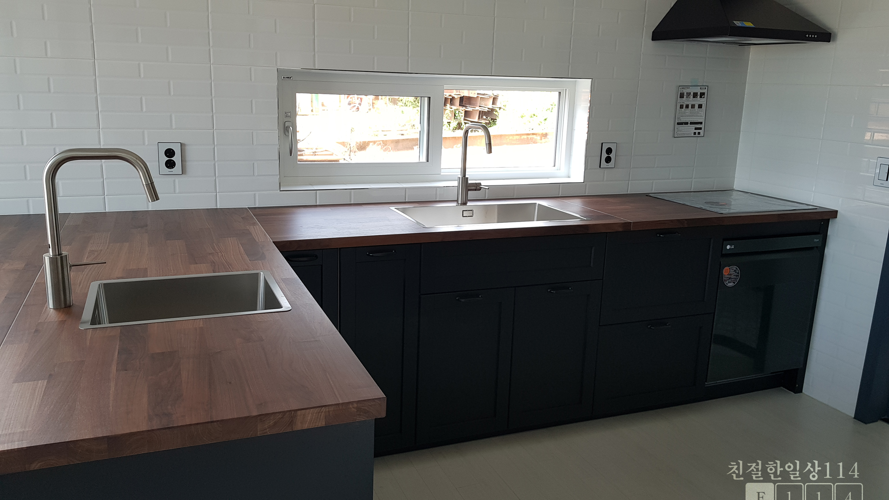 시공 요금 총계: 80만 (서비스: 주방 싱크대 벽쪽 + 거실 건식 세면대 벽쪽)