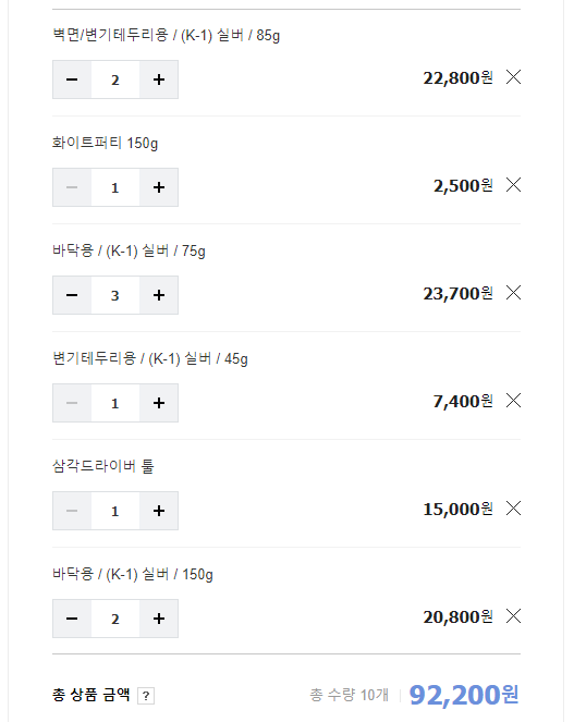 줄눈 시공 할 곳은 [화장실2개, 다용도실, 현관, 주방] 이렇게 5군데이며 거실의 메인 화장실은 벽에도 할 계획이다. 셀프 줄눈 재료를 파는 사이트서 줄눈에 필요한 재료들을 카트에 담아보니 92,200원이 나왔다. 사이트에서 나온 면적=용량 계산방법에 따라서 카트에 담았으며 장갑과 마스킹 테이프 같은 부재료들이 빠져있으니 대략 10만원 정도 들것 같다. 재료비만 놓고보니 정말 저렴하다. 후기를 보면 쉽게 잘 했다는 사람도 있고 너무 힘들었다는 사람도 있다. 줄눈 시공해야하는 면적도 넓고 새집이다보니 깔끔하게 하고 싶어서 업체 시공 견적을 받아보았다.
