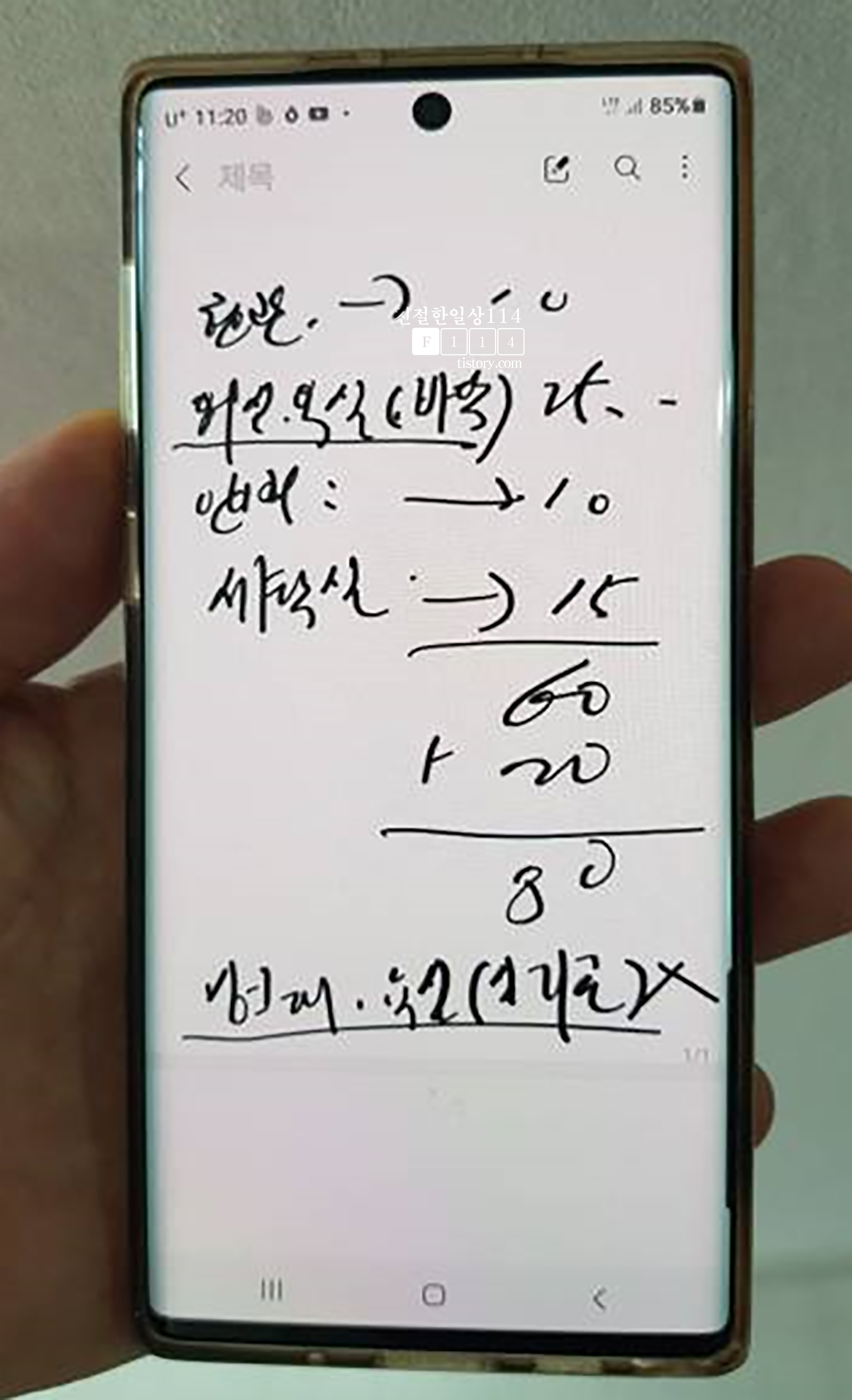 줄눈 업체 사장님과 현장에서 만났다. 줄눈 시공할 공간을 둘러보고 실행 견적 요금을 핸드폰에 적어서 보여준다. (줄눈 시공 할 곳: 다용도실1, 화장실2, 현관1, 주방1 이렇게 5곳의 바닥 + 거실화장실 벽)
