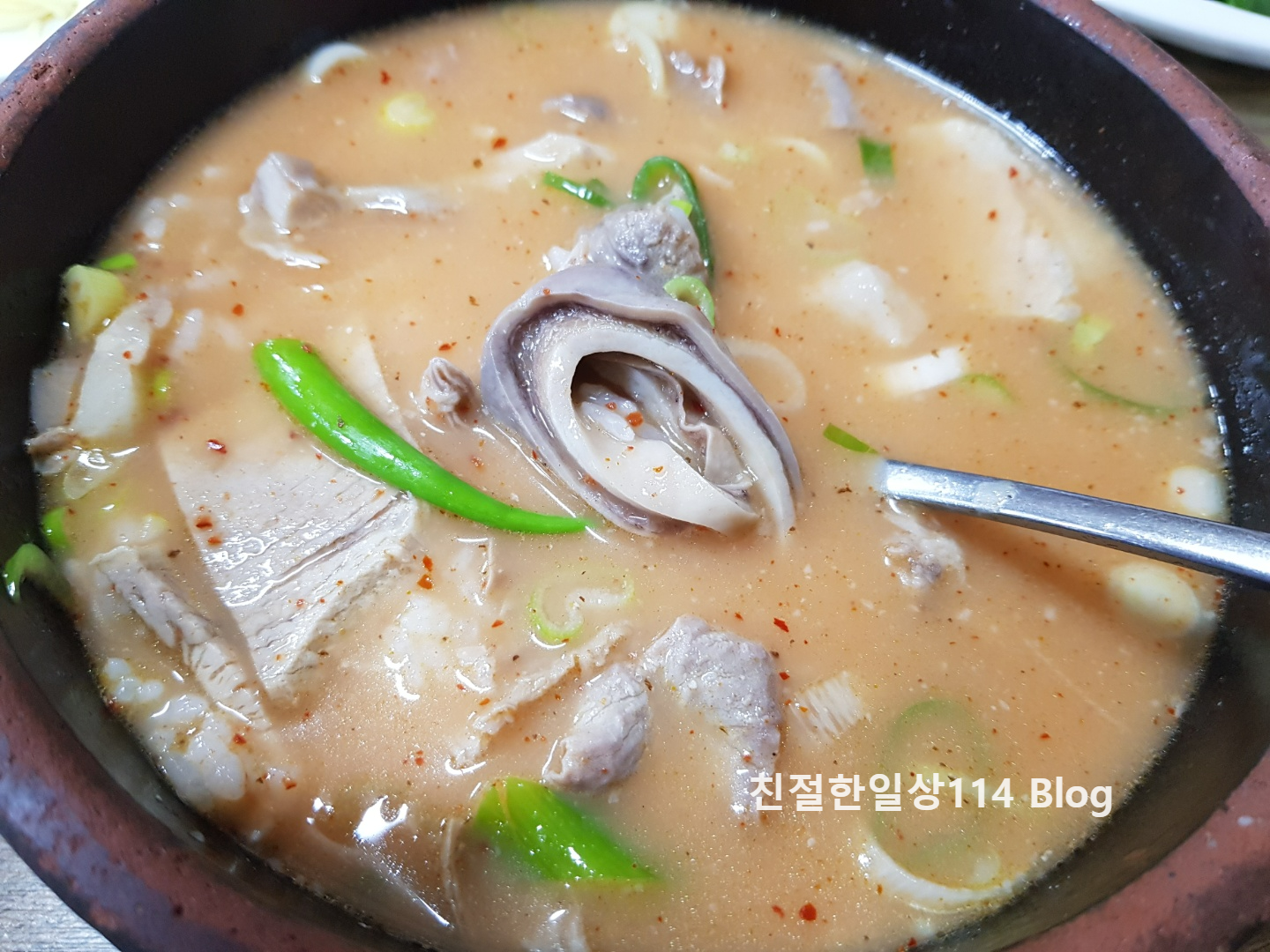 먼저 검색해 보았던 평대로 국물이 진하고 좋았다. 국물은 좋았지만 이날 나왔던 국밥은 그리 뜨겁지 않았다. 뜨겁지 않은 국물이라 부추를 넣지 않고 먹었다. 바로 떠 먹을 수 있어서 편하기는 했지만 이열치열로 뜨끈한 국밥을 땀을 흘리며 먹을 생각으로 방문했기에 못내 아쉬움이 남는다.