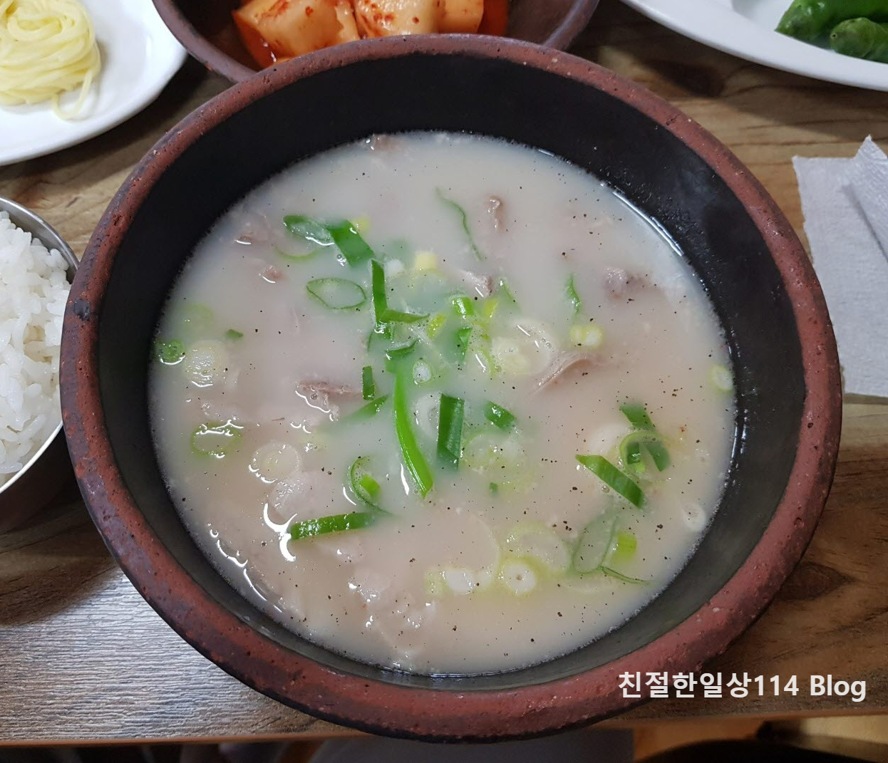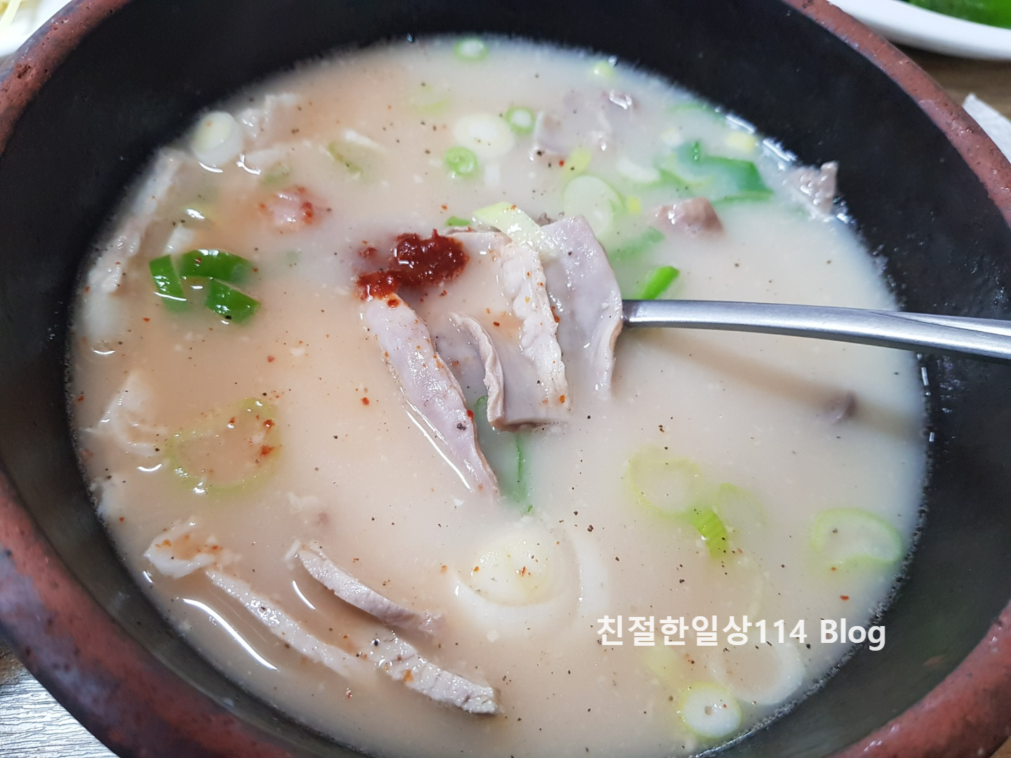 먼저 검색해 보았던 평대로 국물이 진하고 좋았다. 국물은 좋았지만 이날 나왔던 국밥은 그리 뜨겁지 않았다. 뜨겁지 않은 국물이라 부추를 넣지 않고 먹었다. 바로 떠 먹을 수 있어서 편하기는 했지만 이열치열로 뜨끈한 국밥을 땀을 흘리며 먹을 생각으로 방문했기에 못내 아쉬움이 남는다.