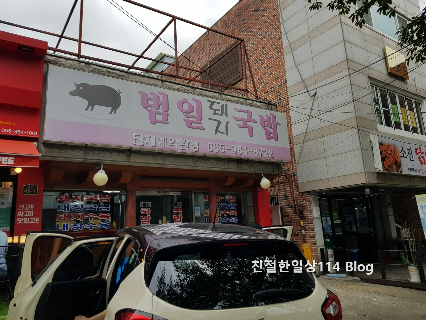 통도사 가는 길목에 위치한 범일돼지국밥집은 주차장이 식당 입구 앞에 마련되어있다. 건물이 크지 않고 옆 커피숍과 붙어있어 주차장이 작다.