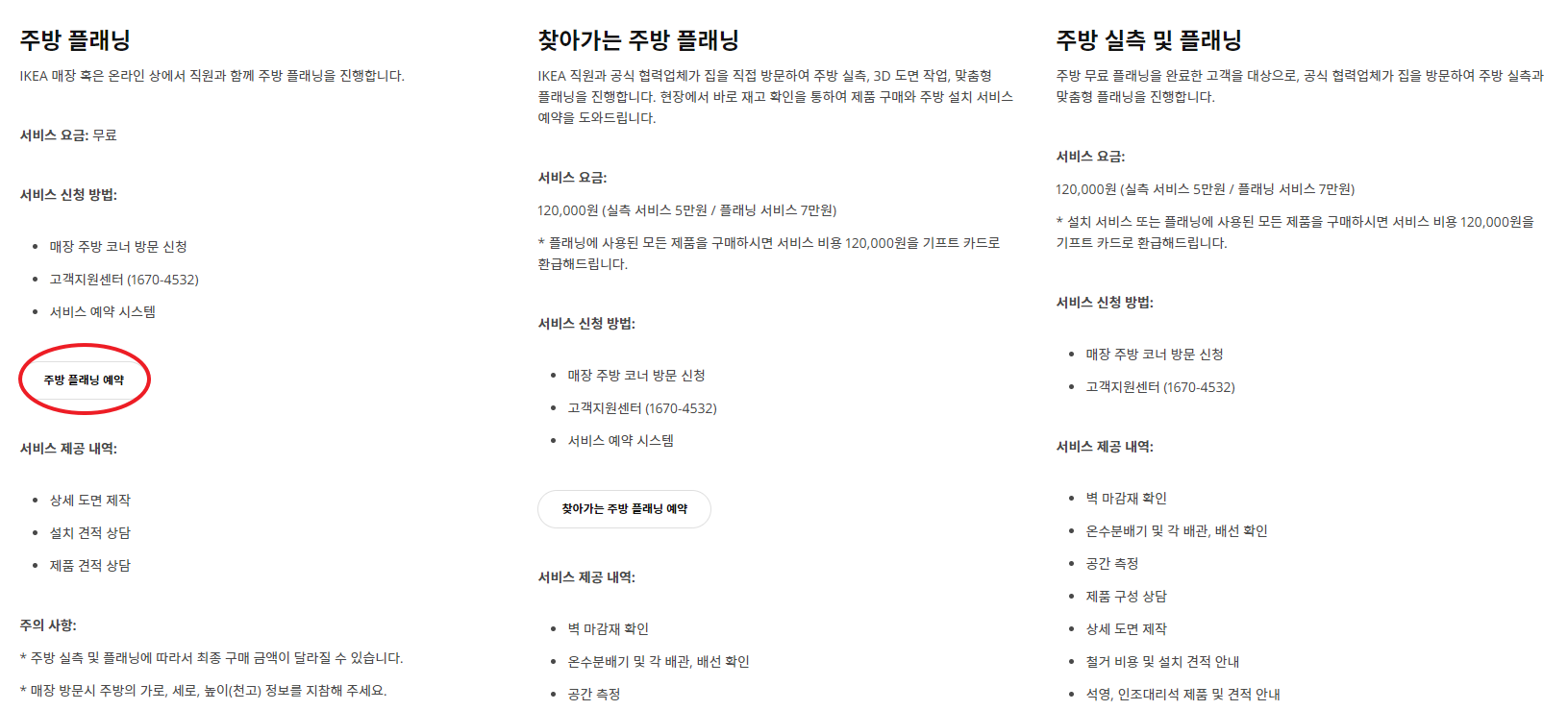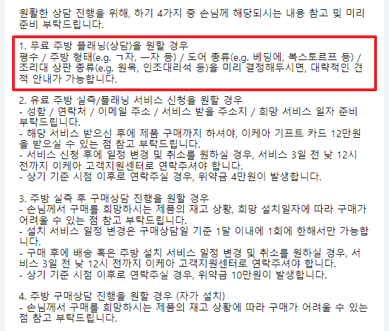 1. 주방플래닝 (온라인 무료) 2. 찾아가는 주방 플래닝 (유료 12만원) 3. 주방 실측 및 플래닝 (유료 12만원)