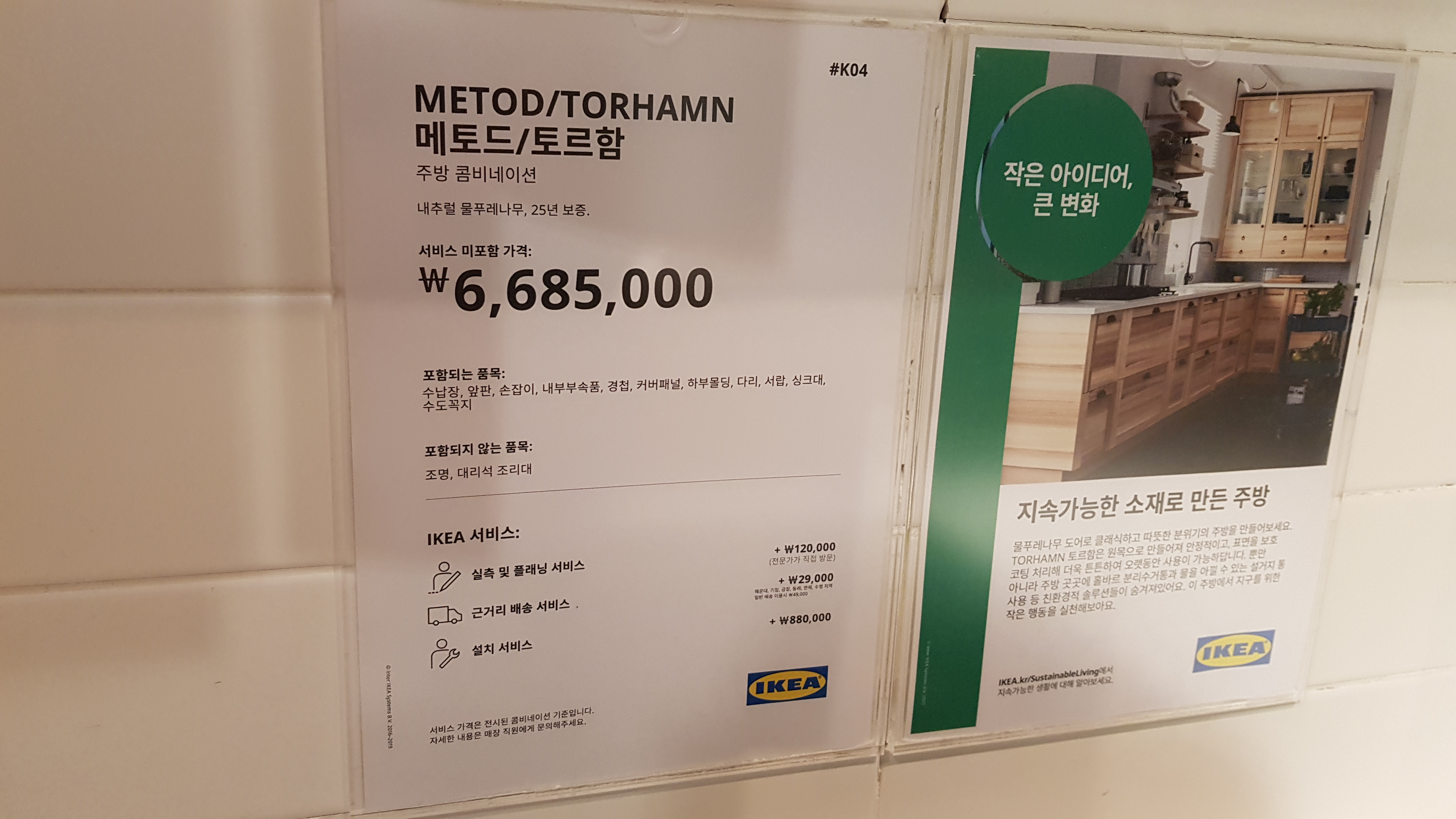 전시되어 있는 싱크대에 가까이 가보면 제품구성과 가격이 적혀있다. 참고로 가격에는 실측견적 서비스와 설치서비스 비용은 포함되어있지 않다.