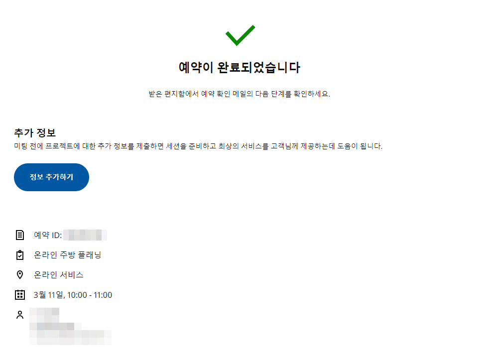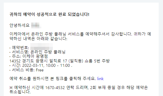 예약정보에 입력한 이메일로 온라인 무료 주방 플래닝(상담) 예약이 완료되었다고 메일이 온다.