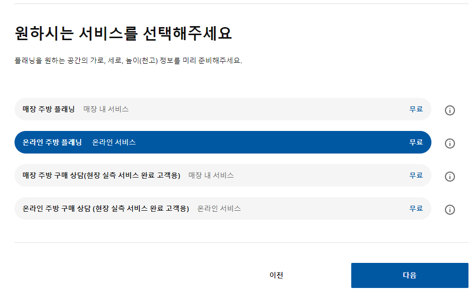 화면에 나오는 서비스 중에서 두번째 온라인 주방 플래닝 서비스를 선택 후 다음으로 넘어간다. 만약 매장 방문해서 무료 플래닝을 받고자 한다면 첫번째 매장 주방 플래닝을 선택하고 진행해도 된다.