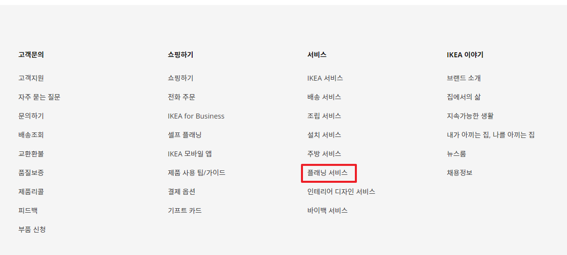 1. 이케아 홈페이지 접속 후 제일 하단 플래닝 서비스 클릭