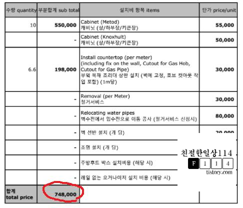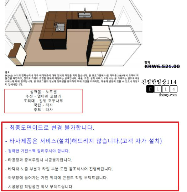 유료 주방 실측 및 플래닝 서비스를 받고 다음날 견적서와 도면을 메일로 받았다. 견적서에는 제품 견적서와 설치비 견적서 이렇게 2가지가 있다. 설치비 견적서는 정확하지만 제품 견적서는 약간의 오차가 있었다.