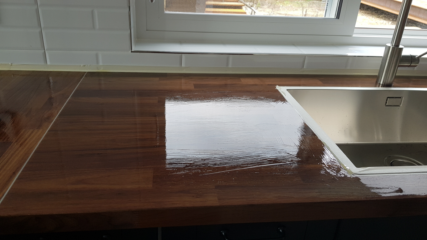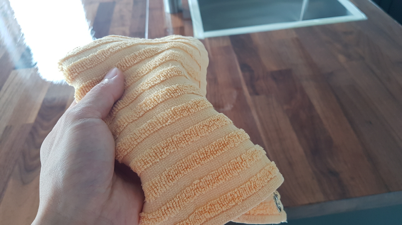 오일을 전체적으로 바르고 난 뒤 모습이다. 싱크대 상판이 반질반질하다. 이렇게 오일을 바르고 나서 20~30분 정도 스며들 수 있도록 기다린다.