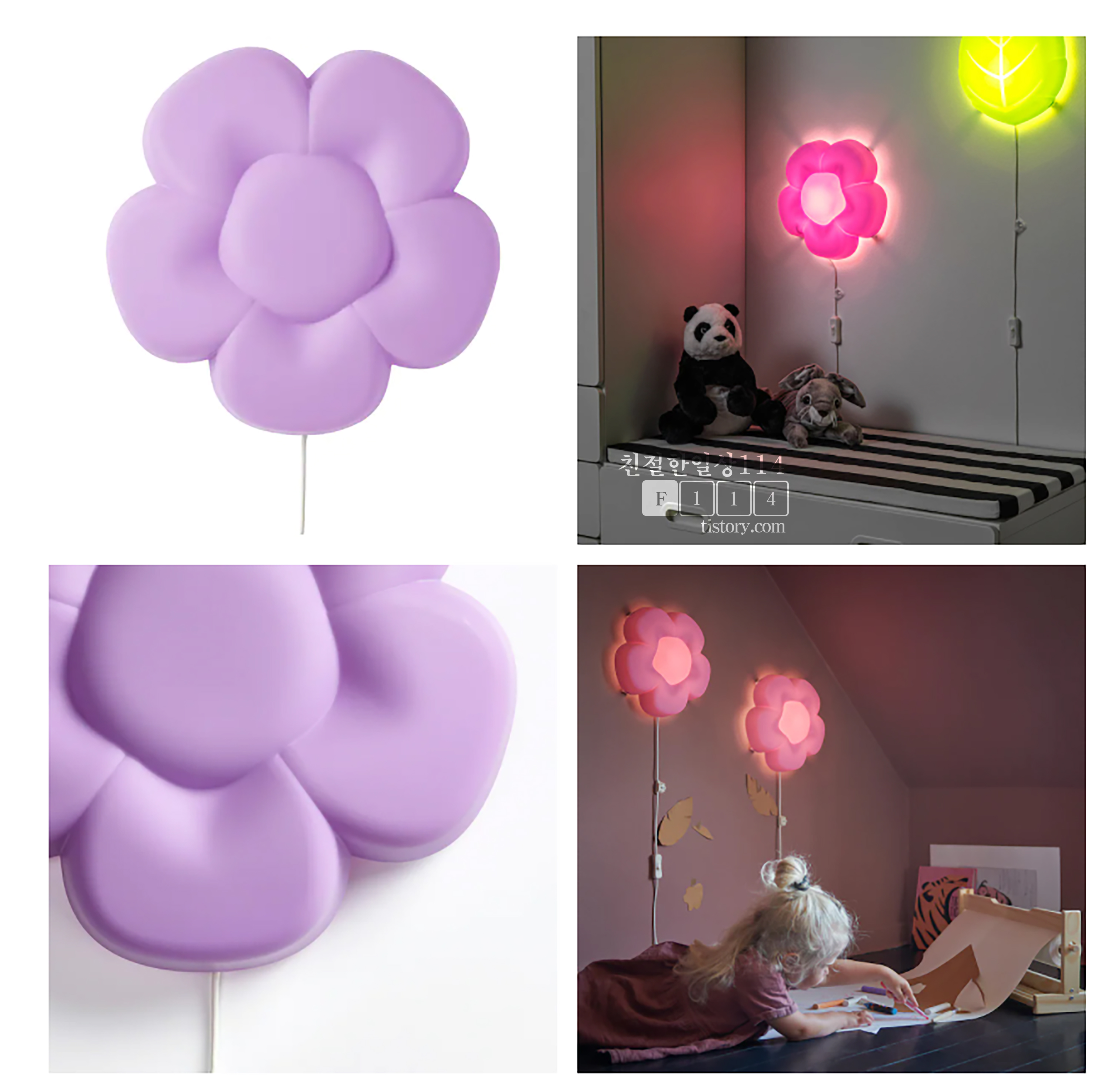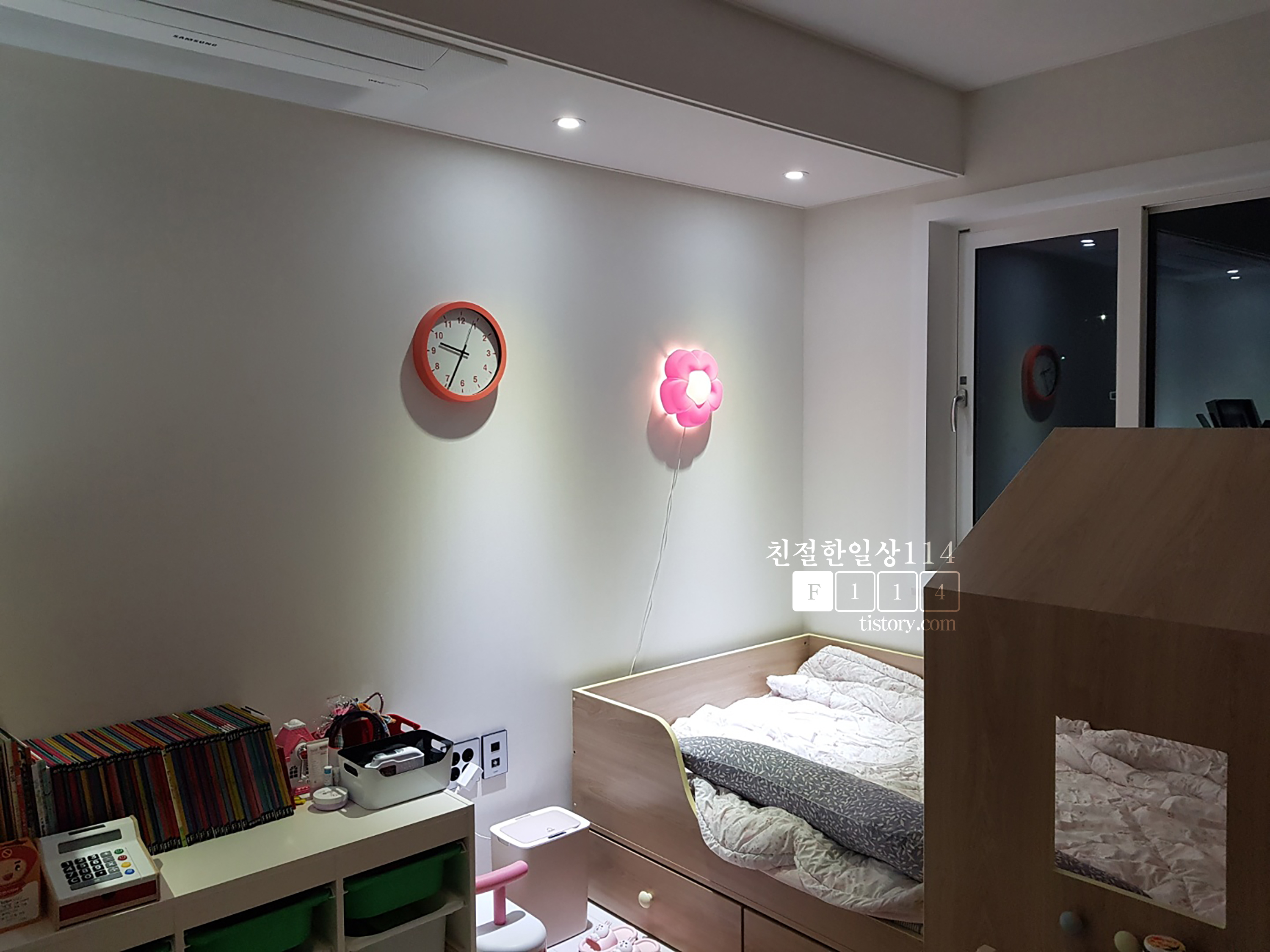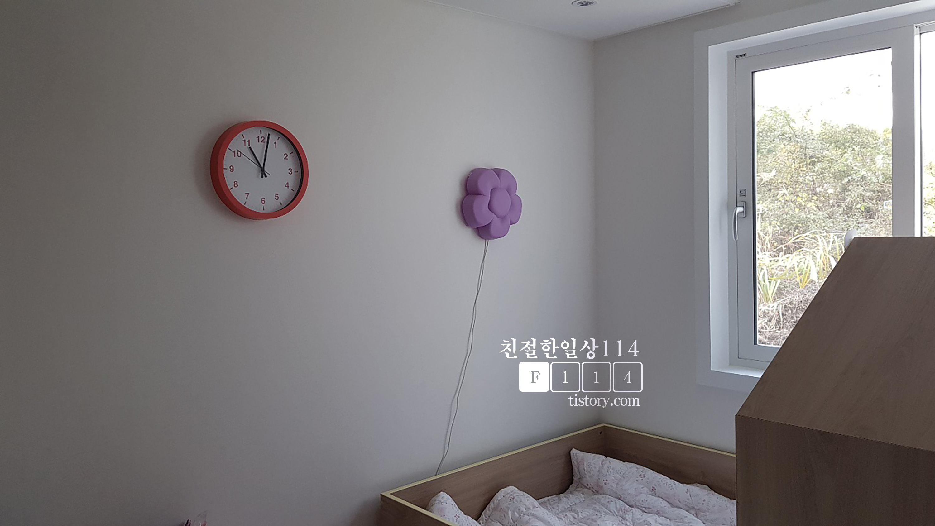 이사를 하기 전 딸아이와 약속을 하나 해 둔 것이 있다. 아이 혼자서 방에 자기로 한 약속이다. 독립수면이라고 하던가? 이를 위해서 아이방에 취침등을 만들어줘야 했다. 혼자서 잔다고는 하지만 처음부터 바로 "안녕히주무세요~" 하고 들어가서 자는건 아니고 잠들기 전에는 같이 누워서 책읽고 재워주긴 해야한다. 잠 들기 전까지 같이 누워서 책을 읽어 줘야하기에 글자가 잘 보여야 하는데 조명이 너무 밝으면 수면에 방해가 되고 그렇다고 너무 어두우면 아이가 무서워 할 수 있다. 그리고 아이의 마음에도 들어야 독립수면에 거부감이 덜할 것이기에 수면등을 선택하는데 고려해야 할 것이 많았다. 지금까지는 안방에 아이침대를 두고 재웠다. 취침 조명으로는 잠들기까지 책을 읽기위해 베란다 불을 켜놓거나 머리맡에 건전지로 켜지는 멜로디형 장난감 조명을 사용했었다. 건전지를 갈아줘야하는 불편함과 그리 실용적이기도 이쁘지도 않았기 때문에 이번에는 끄고 켜기 편리하면서도 수면에도 도움이 되는 은은한 수면등으로 찾아보았다. 이런 조건으로 찾다 구매하게 된 조명은 이케아 어린이용 조명 제품으로 라일락 꽃 모양의 벽부착등이다. 이렇게 바꾼 수면등으로 잠 잘 오는 분위기도 연출시키고 독립수면도 성공한 후기를 사진으로 남겨본다.