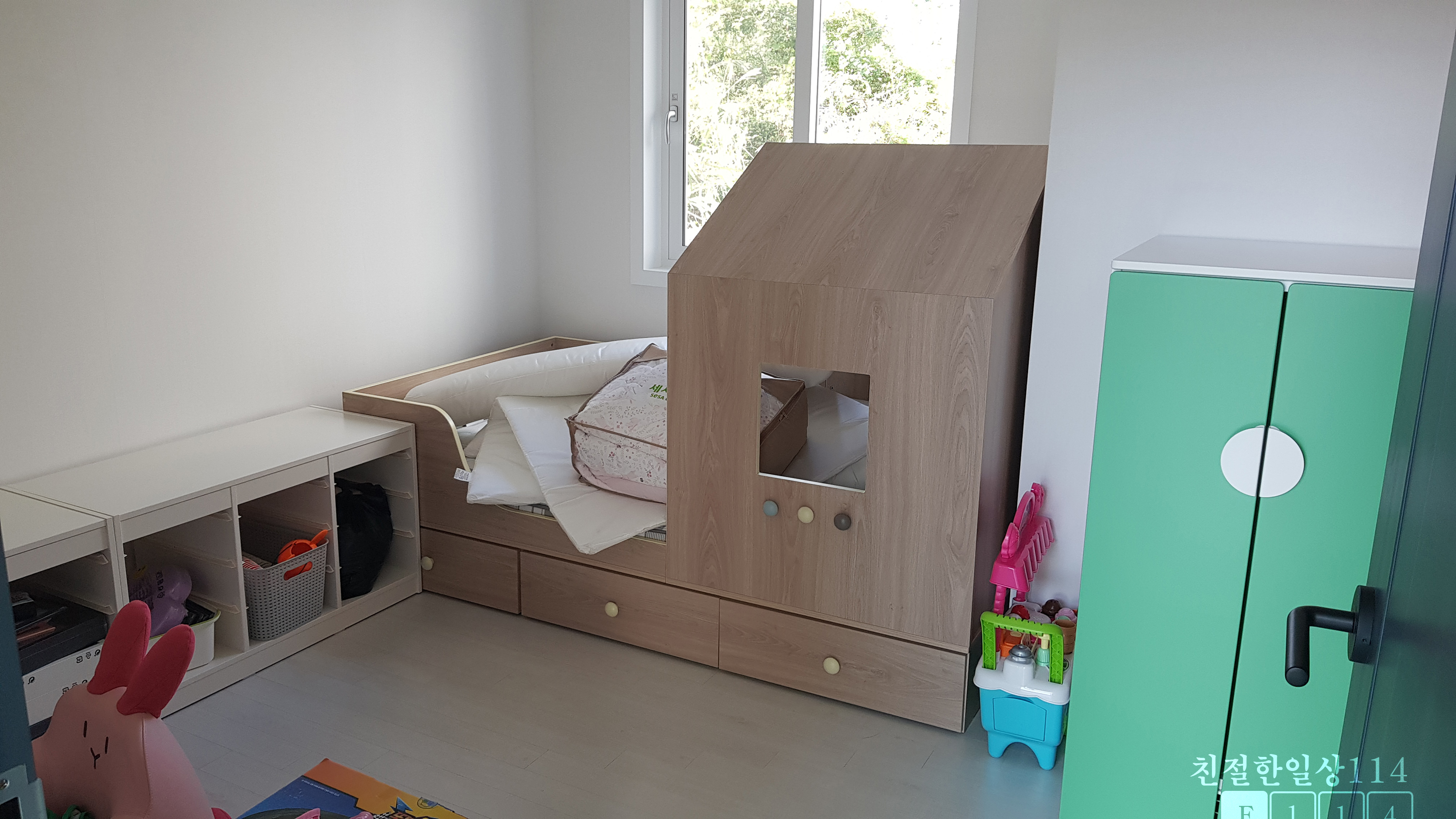 짐을 들여놓고 아직 정리가 안된 상태의 아이방이다. 지금은 정리를 해서 깔끔해 지기도 했지만 수면등도 달아 분위기가 많이 달라졌다.