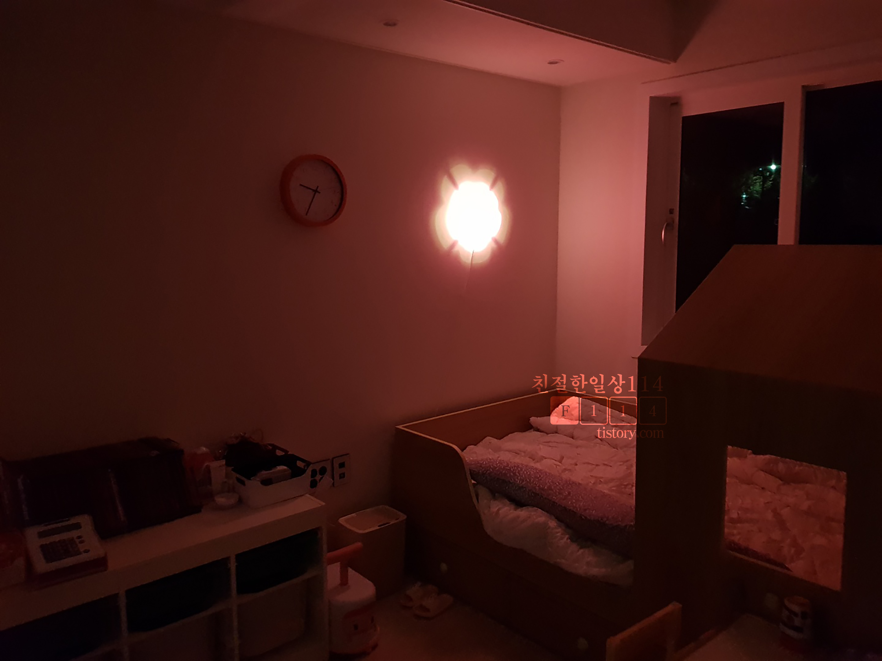 수면등을 달고나서 낮과 밤, 수면등을 껏을 때와 켰을 때이다.