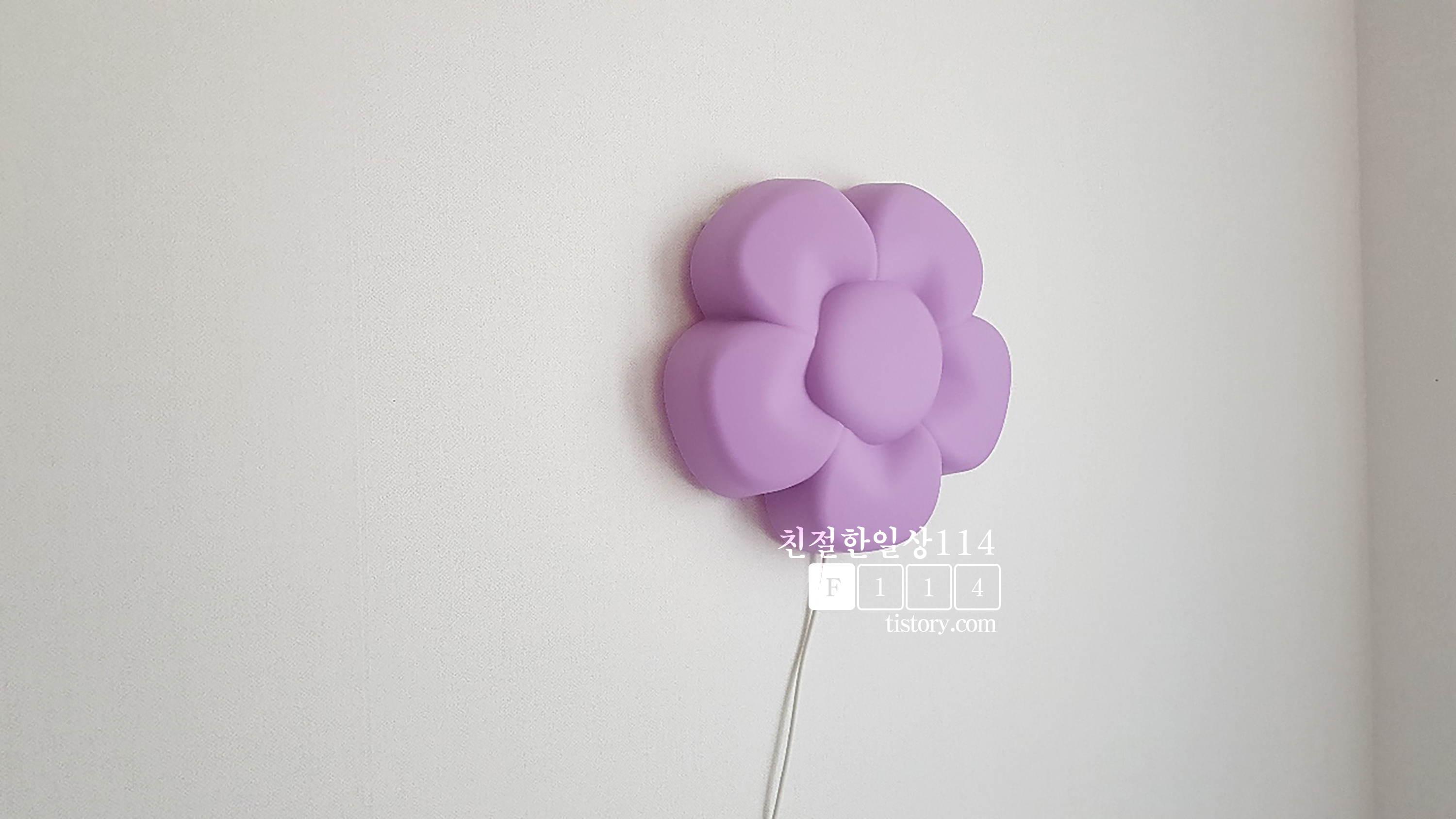이사를 하기 전 딸아이와 약속을 하나 해 둔 것이 있다. 아이 혼자서 방에 자기로 한 약속이다. 독립수면이라고 하던가? 이를 위해서 아이방에 취침등을 만들어줘야 했다. 혼자서 잔다고는 하지만 처음부터 바로 "안녕히주무세요~" 하고 들어가서 자는건 아니고 잠들기 전에는 같이 누워서 책읽고 재워주긴 해야한다. 잠 들기 전까지 같이 누워서 책을 읽어 줘야하기에 글자가 잘 보여야 하는데 조명이 너무 밝으면 수면에 방해가 되고 그렇다고 너무 어두우면 아이가 무서워 할 수 있다. 그리고 아이의 마음에도 들어야 독립수면에 거부감이 덜할 것이기에 수면등을 선택하는데 고려해야 할 것이 많았다. 지금까지는 안방에 아이침대를 두고 재웠다. 취침 조명으로는 잠들기까지 책을 읽기위해 베란다 불을 켜놓거나 머리맡에 건전지로 켜지는 멜로디형 장난감 조명을 사용했었다. 건전지를 갈아줘야하는 불편함과 그리 실용적이기도 이쁘지도 않았기 때문에 이번에는 끄고 켜기 편리하면서도 수면에도 도움이 되는 은은한 수면등으로 찾아보았다. 이런 조건으로 찾다 구매하게 된 조명은 이케아 어린이용 조명 제품으로 라일락 꽃 모양의 벽부착등이다. 이렇게 바꾼 수면등으로 잠 잘 오는 분위기도 연출시키고 독립수면도 성공한 후기를 사진으로 남겨본다.