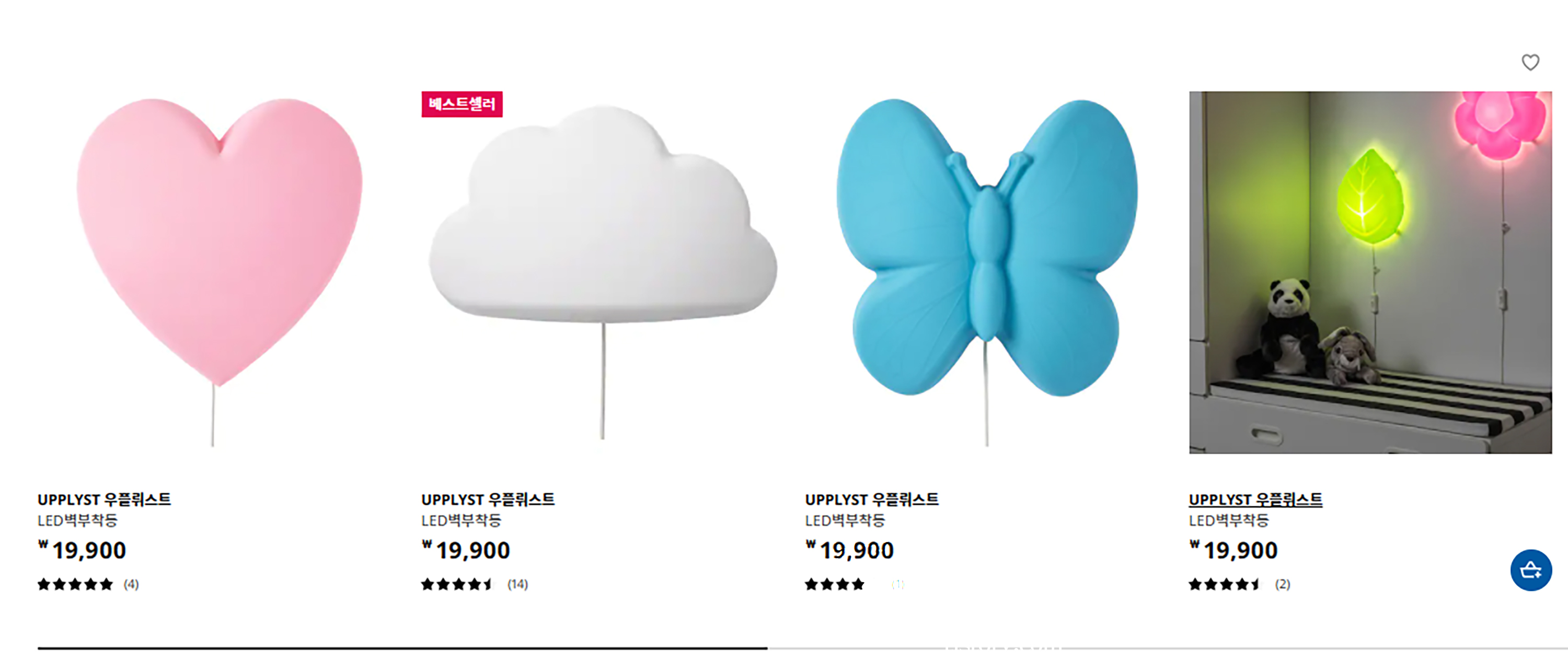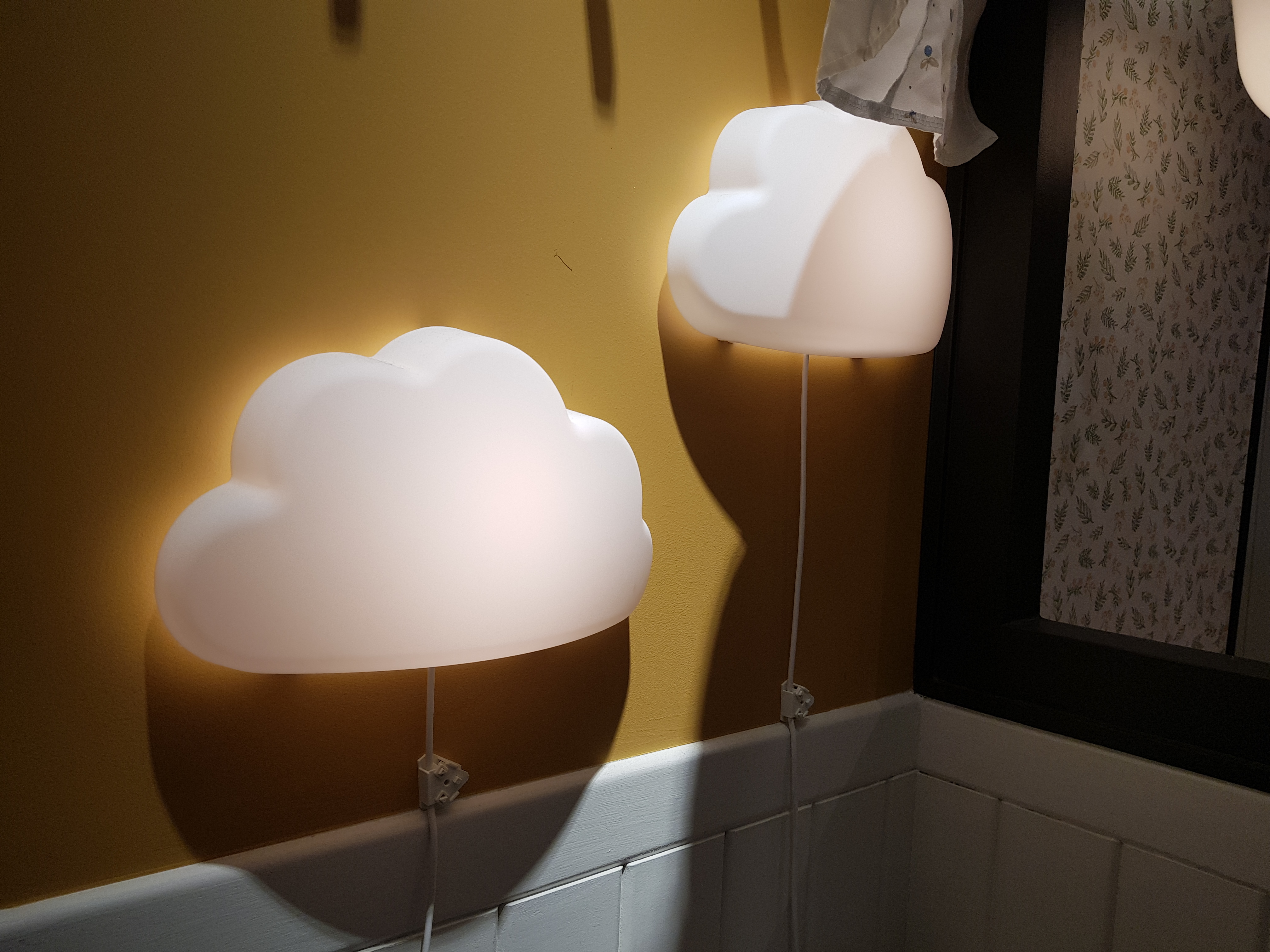 이케아에 들렸을때 어린이코너에서 보았던 벽부착형 수면등이 적당해 보였다. 여러가지 디자인이 있어서 취향껏 고를 수도 있다. 하트나 꽃, 구름 모양이 괜찮아 보인다.