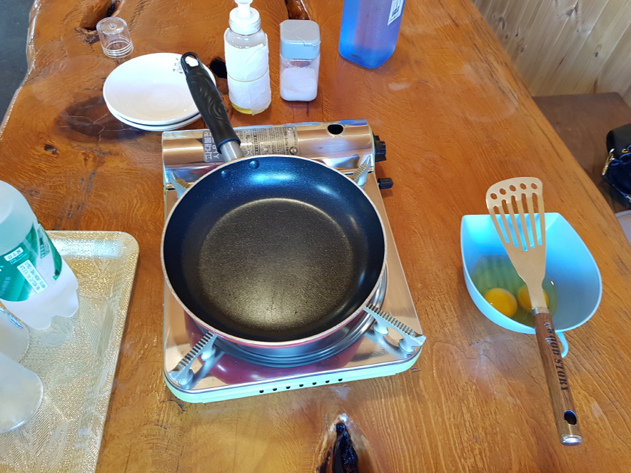특이하게 날계란이 그릇에 담겨나온다. 그리고 후라이팬과 버너도 테이블에 올려 놓으시며 후라이해서 먹으면 된다고 알려주신다.
