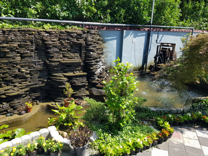 그리 넓지도 좁지도 않은 마당이 있었는데 이곳에는 그늘 의자와 트렘벌린, 야외 테이블 그리고 미니 호수가 있었다.